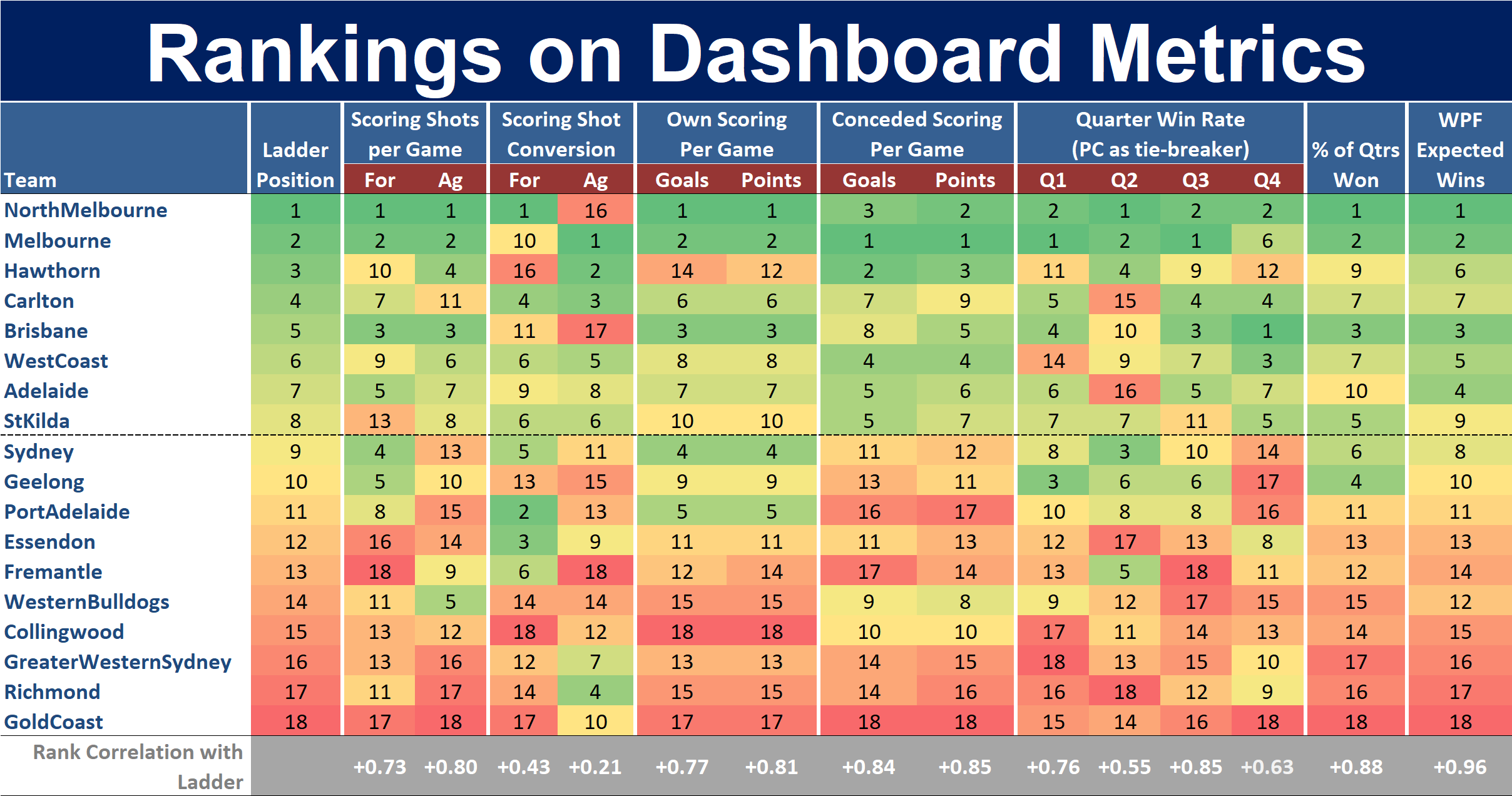 The Team Dashboard metric rankings appear below and reveal that the metric rankings most associated with ladder position are: