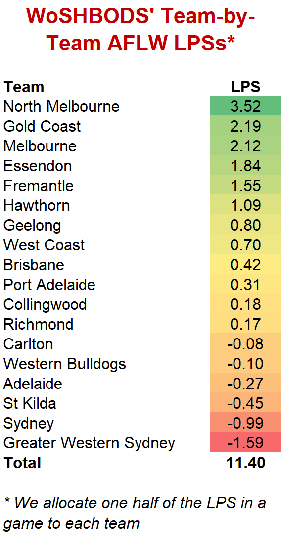 Next let’s look at LPS by team, which essentially measures how predictable, in a probabilistic sense, each team’s win and loss record has been (and which is I think showed the results only for a round or two last week).