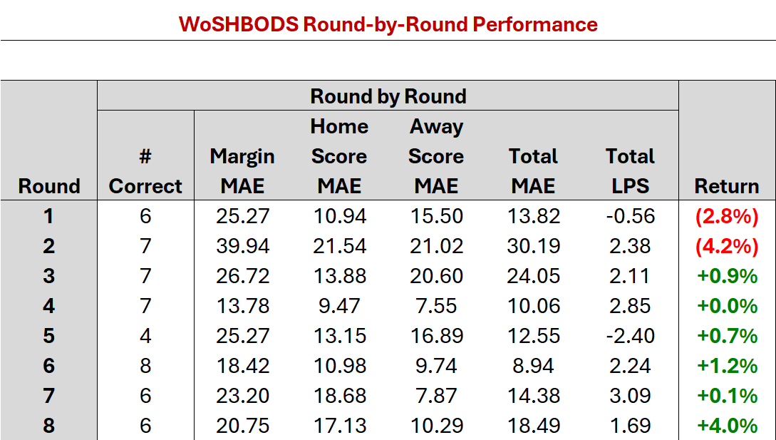 WoSHBODS also recorded a Margin MAE of 20.8 points per game (compared to 22.6 and 22.7 for the bookmakers) and a Totals MAE of 18.5 points per game (compared to 17.1 for both bookmakers).