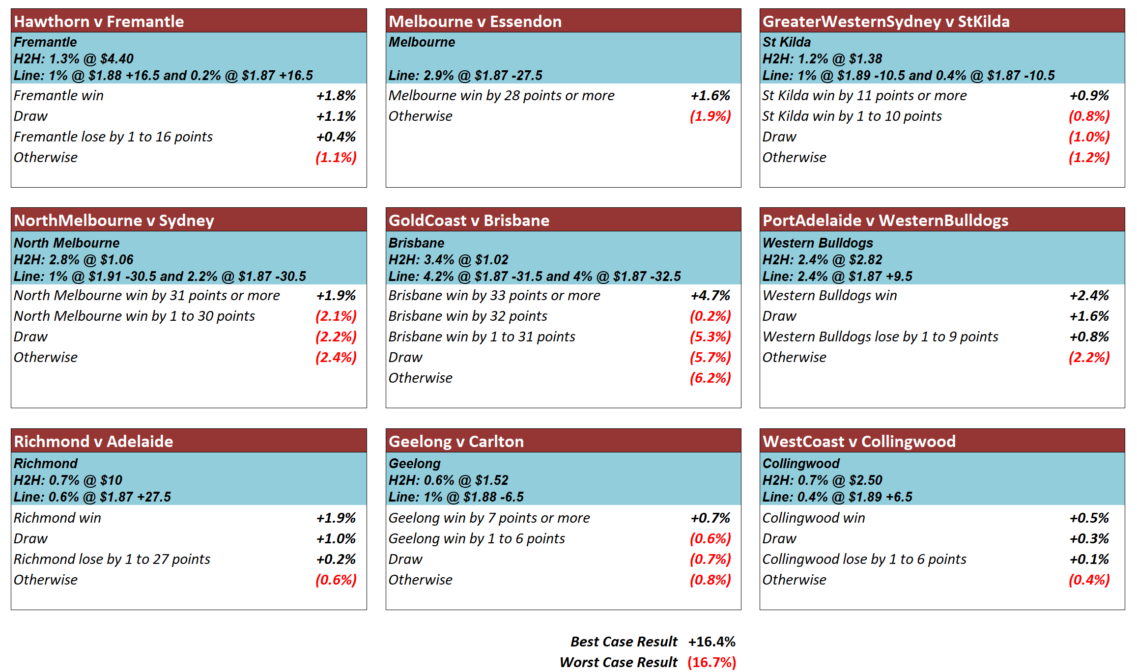 Altogther, as noted, almost 17% of the Combined Portfolio is at risk across all 17 wagers, and a best case set of results would see that risk rewarded by a lift in the Portfolio price of just over 16c.