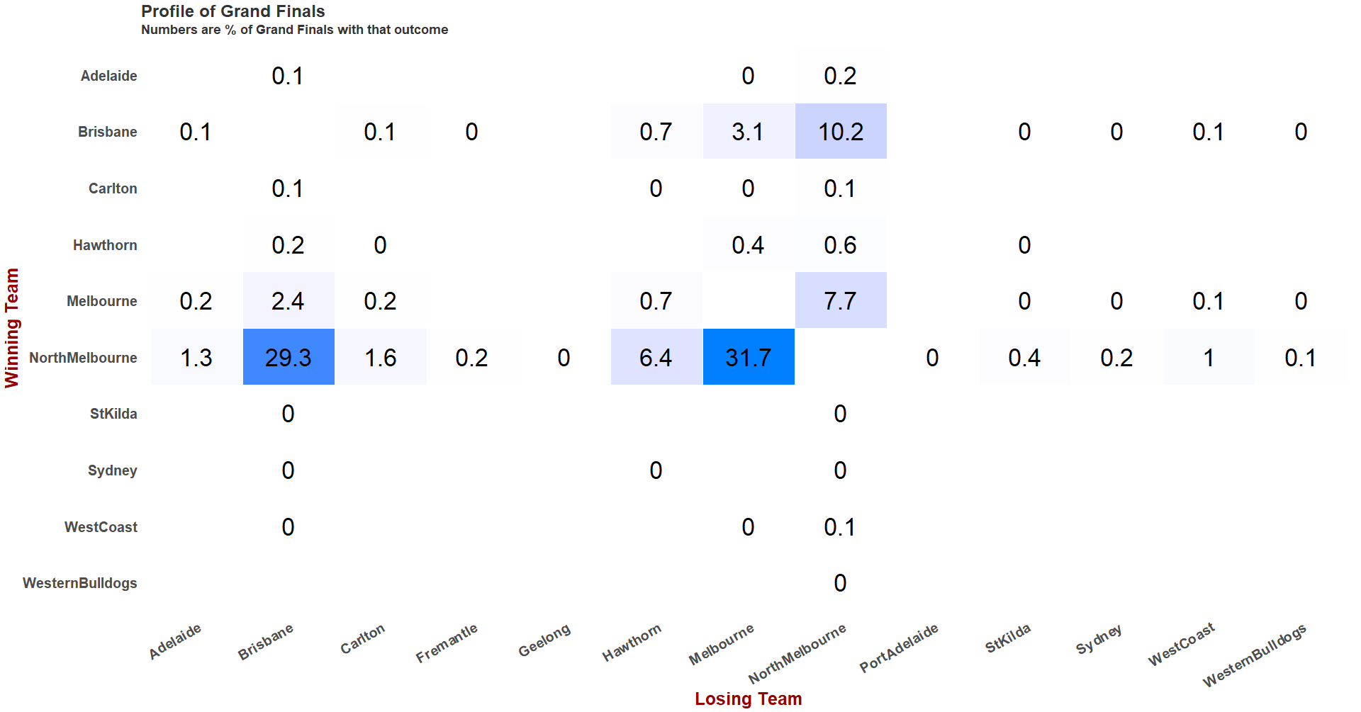 Another 10% are accounted for by Brisbane defeating North Melbourne, and another 8% by Melbourne defeating North Melbourne.