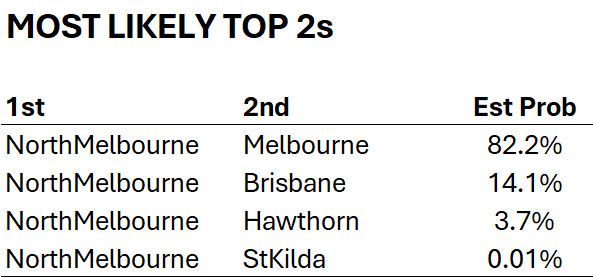 Just over 80% of those replicates had North Melbourne in 1st and Melbourne in 2nd, and another just under 15% had North Melbourne in 1st and Brisbane in 2nd.