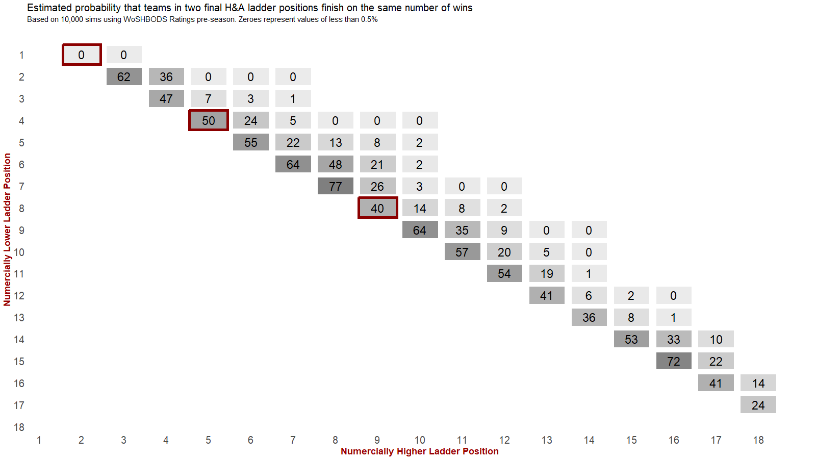 Next we’ll use the simulations to investigate the estimated likelihood that any given pair of ladder positions will be determined after Round 12 based on percentage.