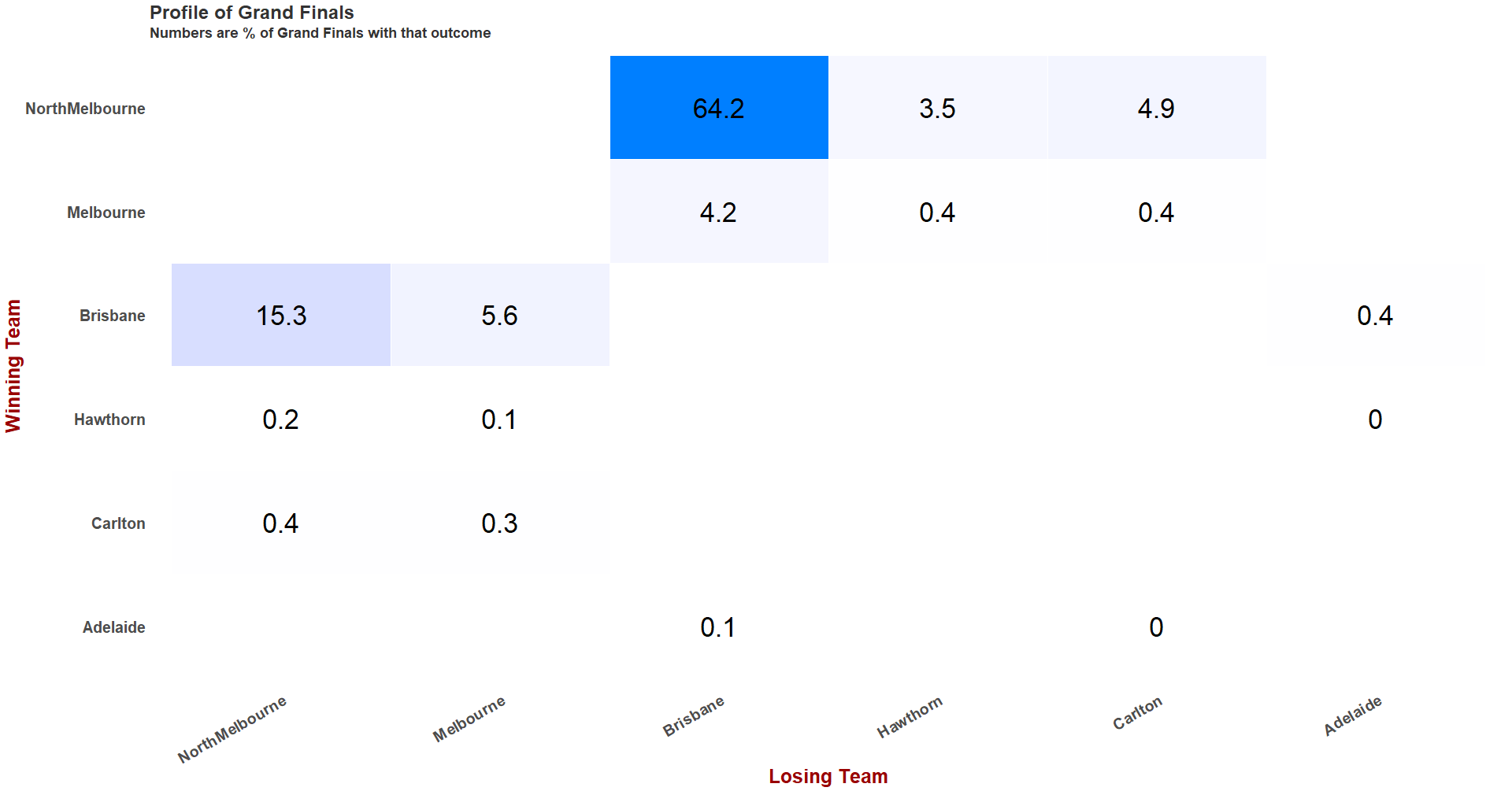 In total, North Melbourne appears in 89% of all Grand Finals, Brisbane in 89% also, Melbourne in 11%, and Hawthorn in 4%. Between them, the four other teams appear in just 7% of Grand Finals, with Carlton accounting for over 70% of that.