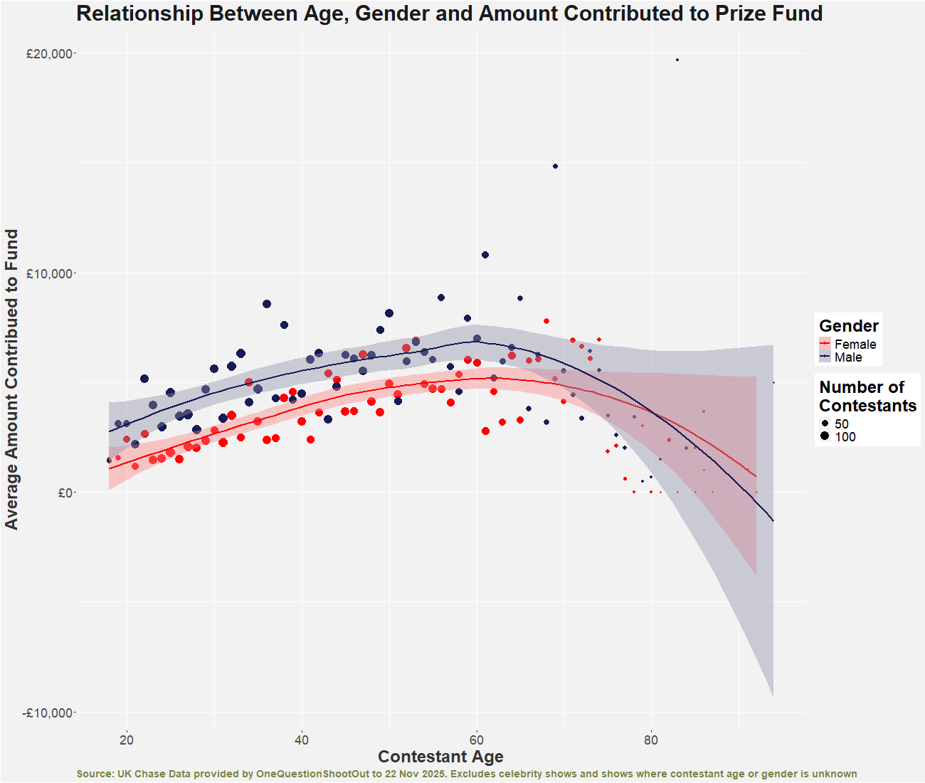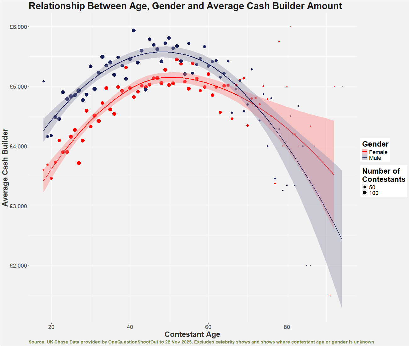 That analysis is summarised in the chart below but, before getting into what we can glean from this chart, here’s a quick explanation of what’s here, much of which will be helpful in interpreting other of the charts in this blog. Each dot represents the average Cash Builder amount accrued by contestants of a given age and gender with contestants getting older as we move from left to right and accruing larger amounts as we move up the chart. The size of the dot reflects how many contestants it represents. The larger the dot, the more contestants there have been of that age and gender.