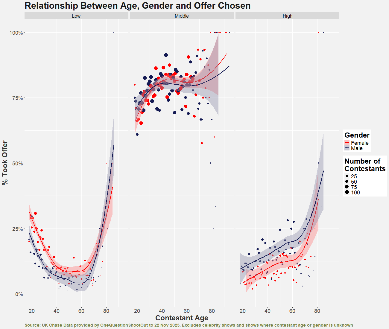 Whilst we do see the by now familiar inverse-U shape here, it seems to be less concave than what we’ve seen earlier in many of the charts, perhaps here because of the greater proclivity of the the middle- and older-aged to take the High offer and the younger contestants greater proclivity to take the Low offer.