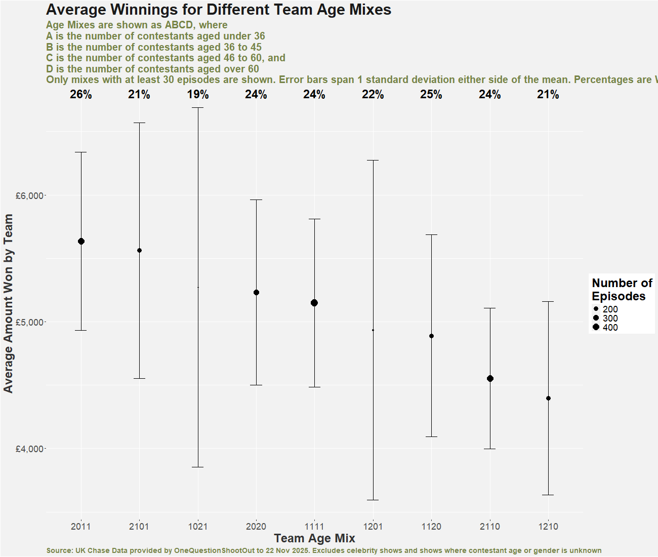 Combined they represent 19 episodes with an average Team Winning of over £10,000. So it might well be then that stuffing your team full of 46 to 60 year olds is the optimal strategy, but we are lacking sufficient data to test this.