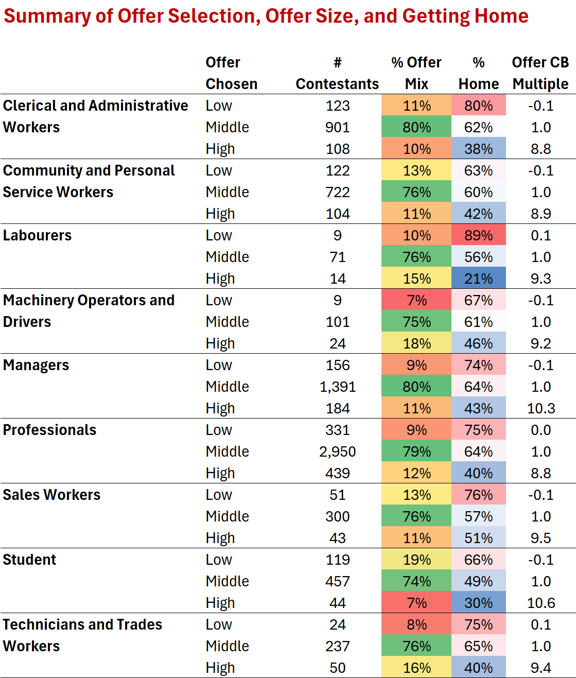 Contestants classified as Machinery Operators and Drivers have the highest average Contribution to the Prize Fund of £6,280. That’s because, as we can see in the table at right, they have a relatively high propensity to take the higher offer, and the second highest propensity to defeat the Chaser when they do choose this amount. (Also, on average, their High Offer is about 9.2 times their Cash Builder, which is similar to the ratio that other occupation groups enjoy)