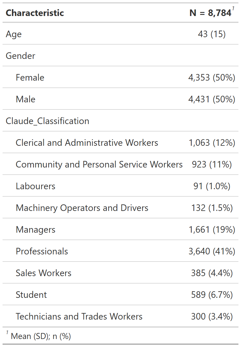 From the table at right we see that we have 8,784 such contestants whose average age is 43, who are split near 50:50 on gender, and who are predominantly classified by Claude as “Professional” (41%) or “Managers” (19%).