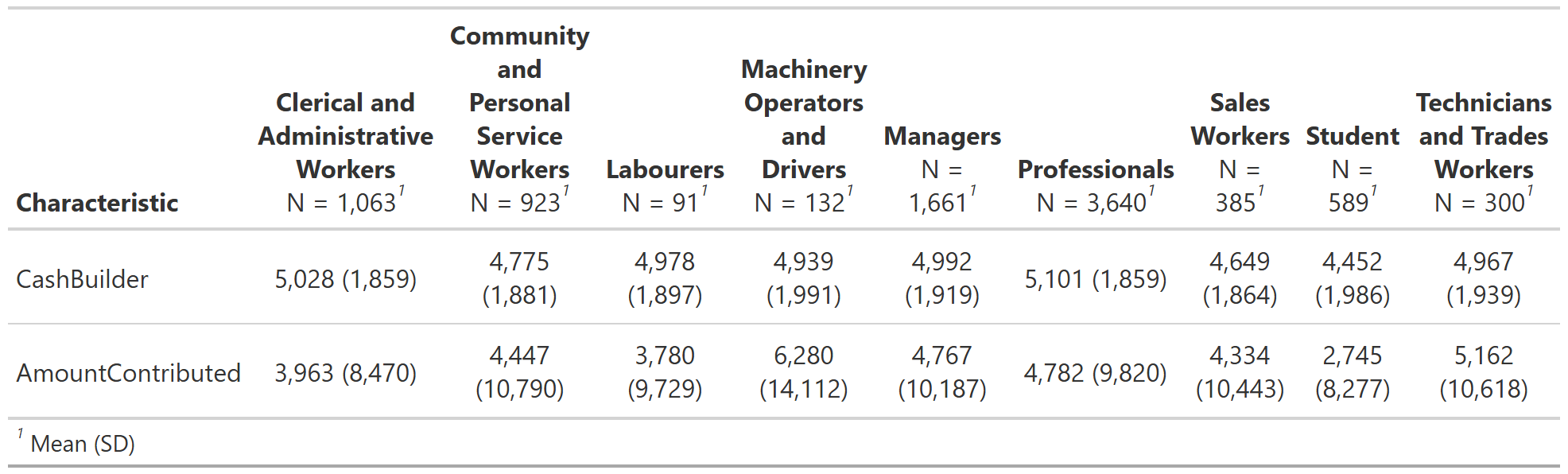 Note the relatively large standard errors associated with the Cash Builder amounts for all occupation groups, signifying that occupation group is unlikely to be a very useful predictor of Cash Builder amounts