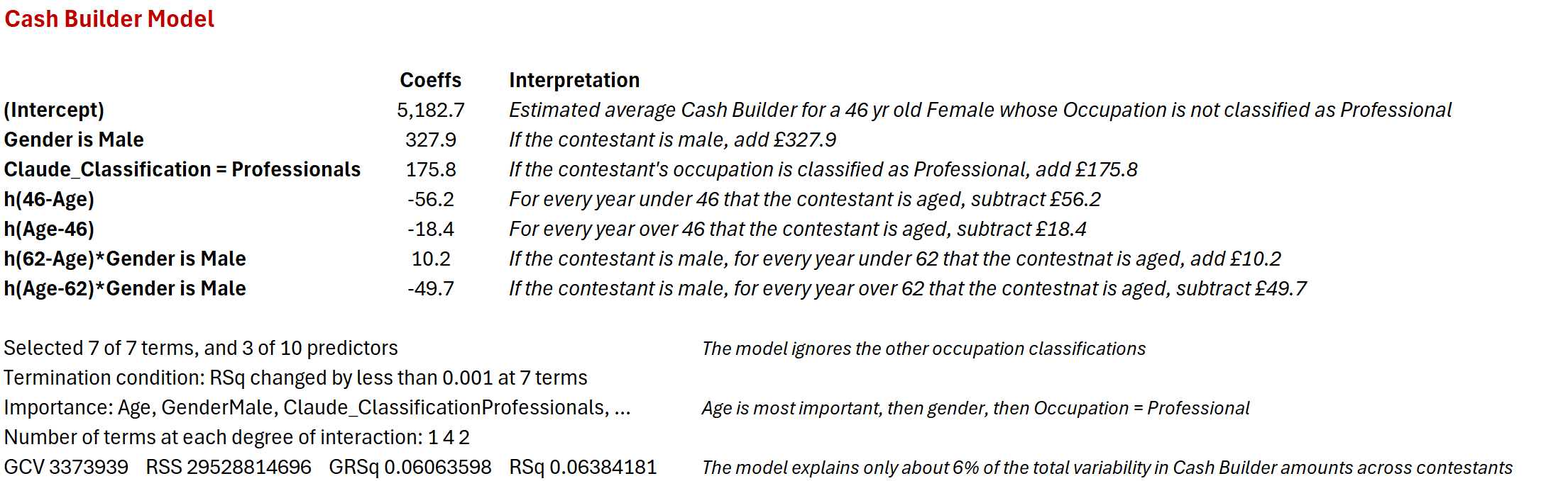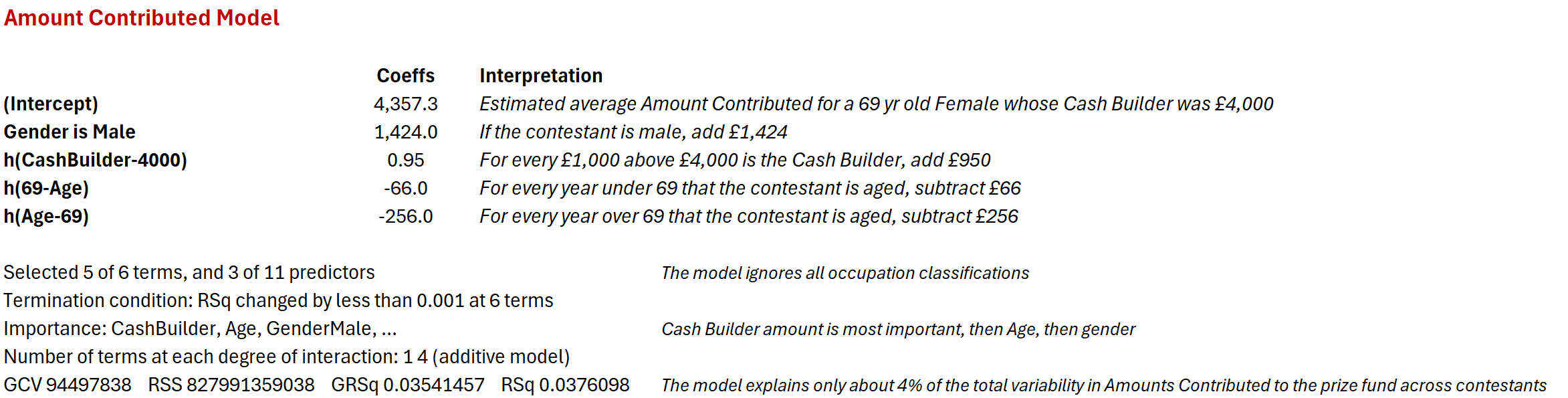 In this first model we look to predict a contestant’s Cash Builder based on his or her gender, age, and occupation category. The model type is a Multivariate Adaptive Regression Spline, and it has a number of appealling features: