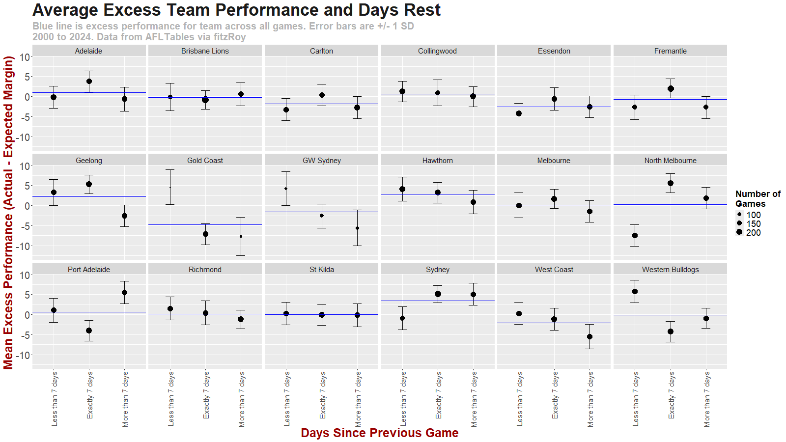 For most teams, having less than 7 days between games appears to have little to no effect on their performance relative to expectation. North Melbourne and Sydney are the obvious exceptions. As counterexamples, Gold Coast , GWS and Western Bulldogs appear to do relatively better on less rest, although Gold Coast and GWS have relatively small sample sizes