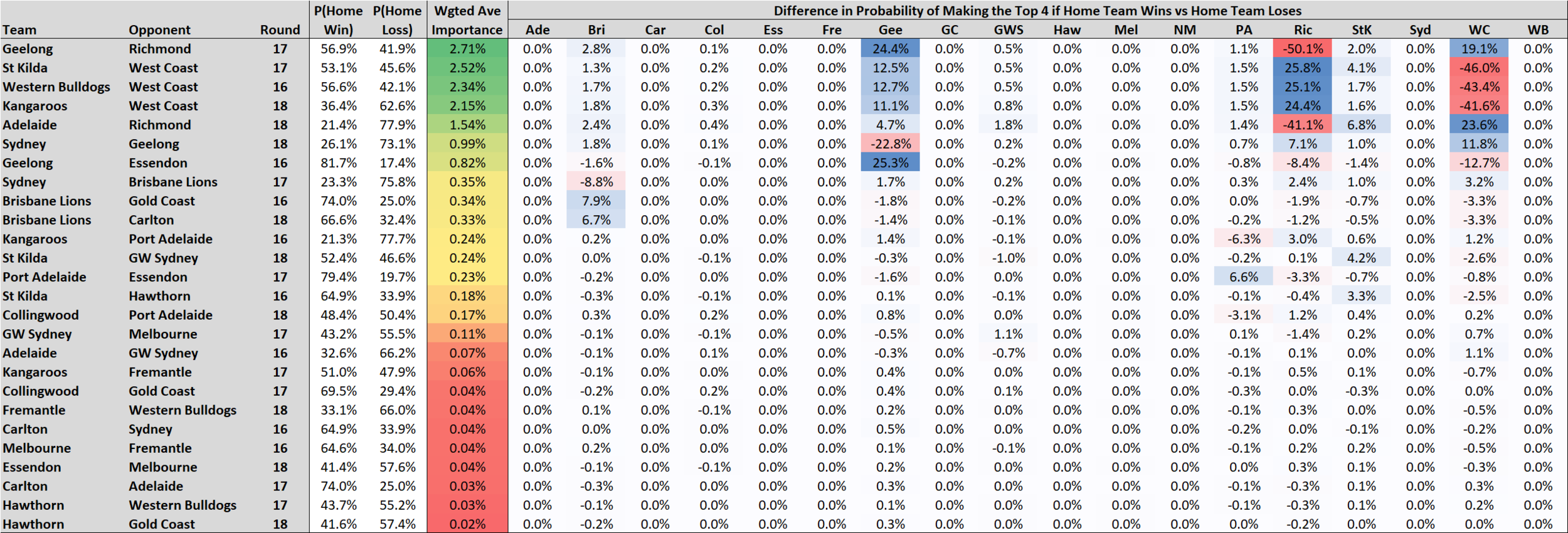 Turning next, and lastly, to impacts on the Top 4, we see that it’s still two games from Round 17 that are expected to have the most impact.