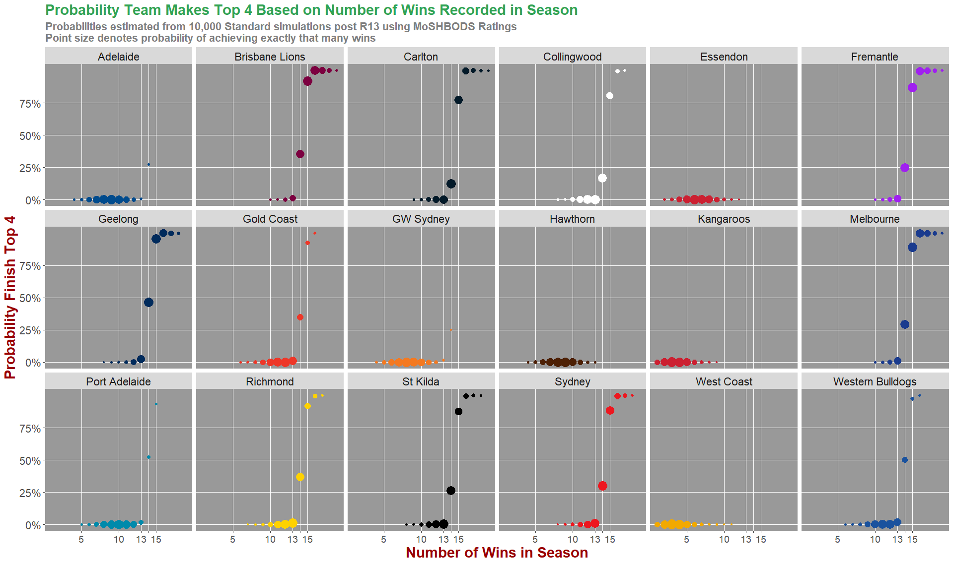We see that most teams’ chances of playing Finals still increase only if they win at least 3 of their next 5 games, the exceptions being Adelaide, Essendon, GWS, Hawthorn, North Melbourne, and West Coast whose chances would only remain roughly the same with 3 wins. Port Adelaide and Richmond see their chances only increase very slightly with 3 wins.