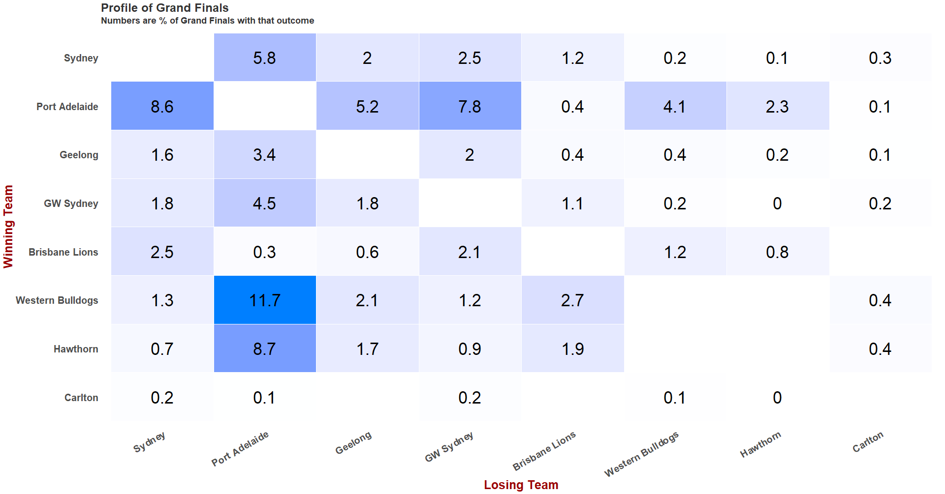 Port Adelaide figures in all of the five most-likely pairings with, in order, Western Bulldogs (16%), Sydney (14%), GWS (12%), Hawthorn (11%), and Geelong (9%). It appears with Brisbane Lions in 1% of Grand Finals, and with Carlton in 0.2%.