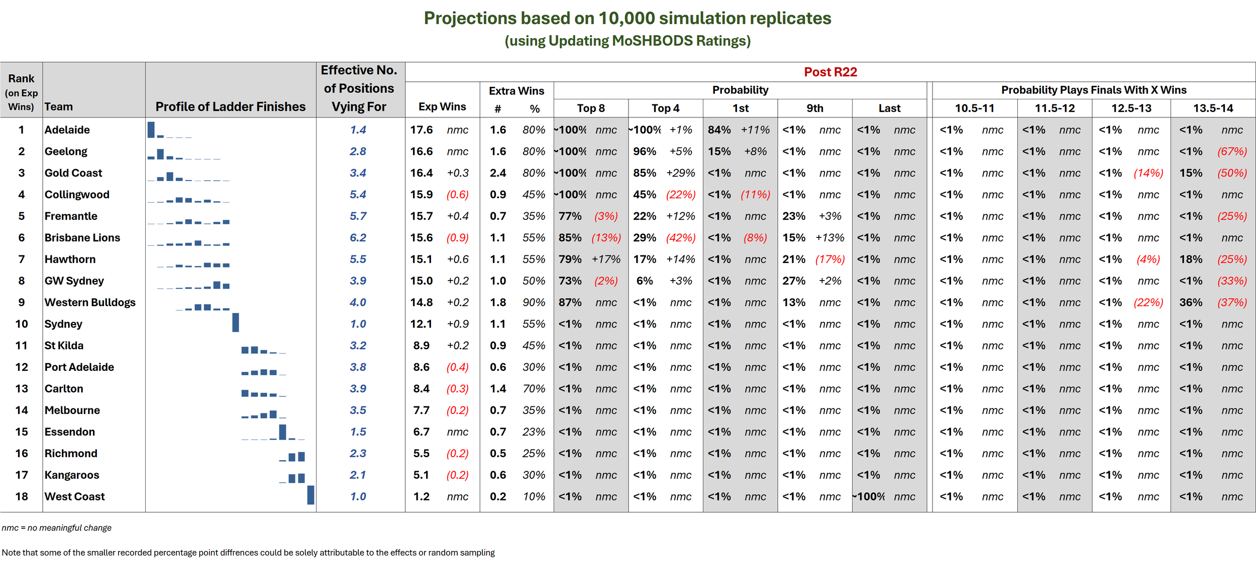 Sydney, St Kilda, Port Adelaide, Carlton, Melbourne, Essendon, Richmond, North Melbourne, and West Coast: <1% chances of being finalists; <1% chance of Top 4; <1% chance of being Minor Premier