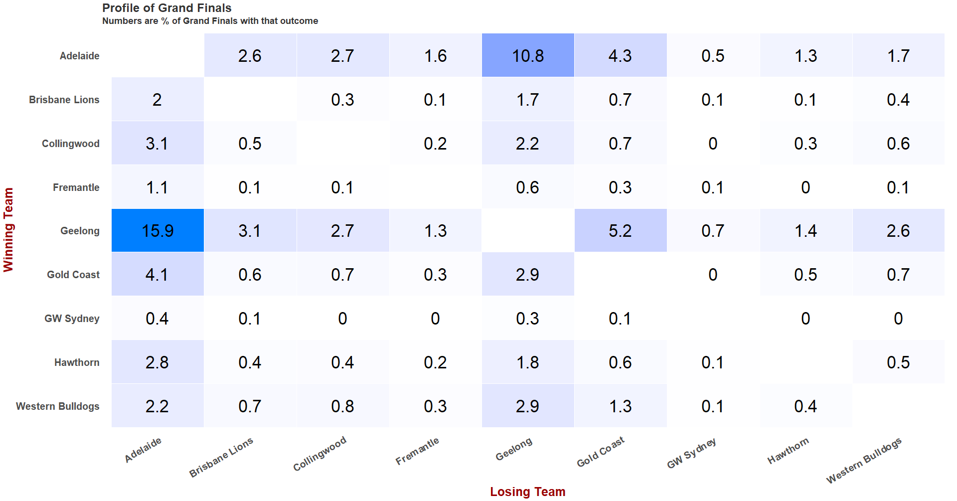 The most common pairing is Geelong / Adelaide, which accounts for about 27% of all Grand Finals. Geelong wins about 60% of those. For other pairings, we have: