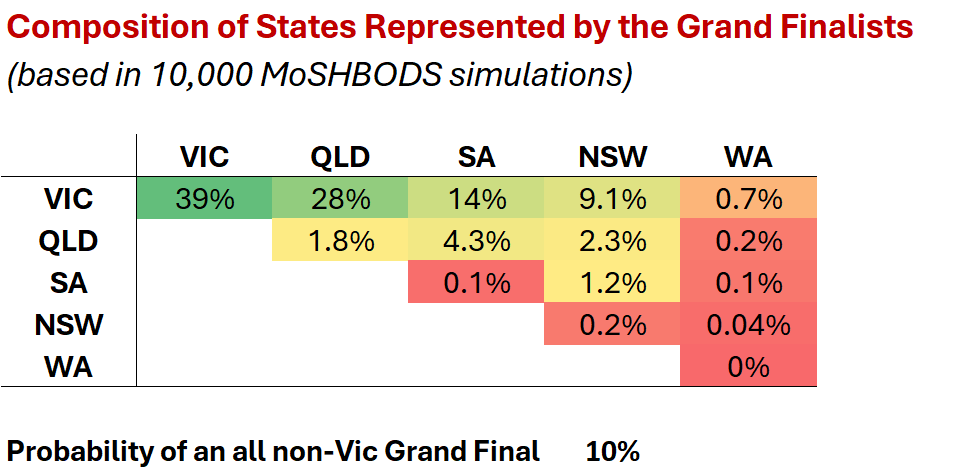 The new numbers suggest that there’s about a 2-in-5 chance that both of the Grand Finalists will be from Victoria, and about another 1-in-2 chance that just one of the Grand Finalists will be a Victorian team.