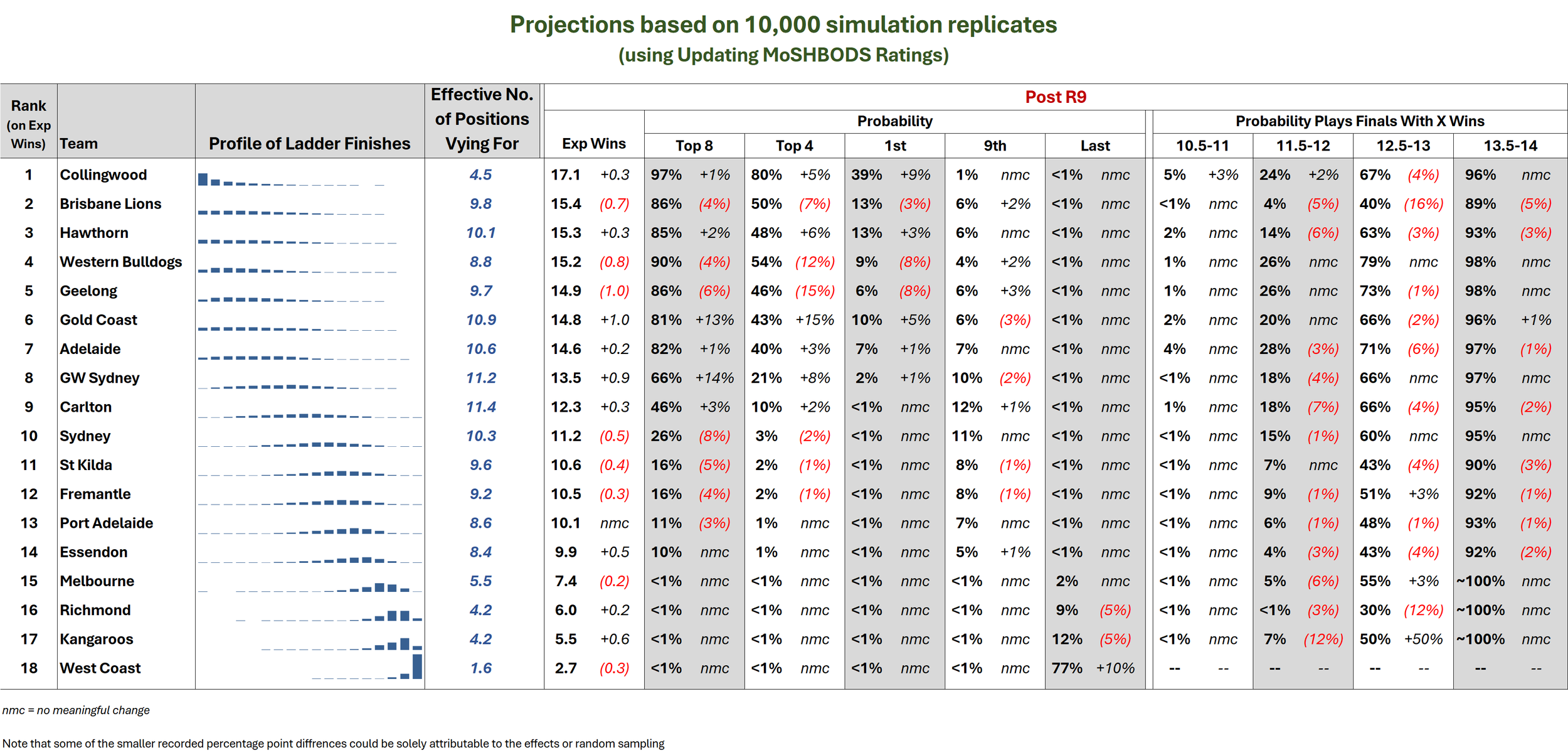 We now have 9 teams with about or better than 1-in-2 chances of finishing Top 8, seven with about or better than 40% chances of finishing Top 4, and four with 10% or better chances of finishing as the Minor Premier.