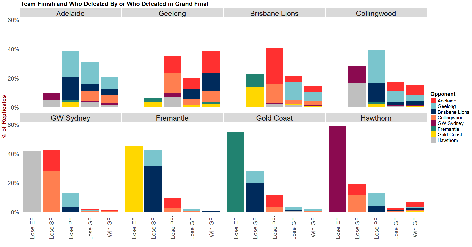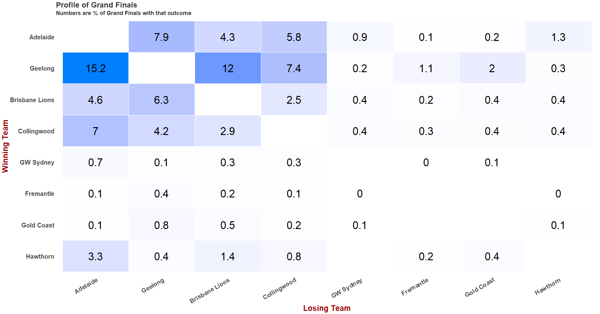 Collingwood / Adelaide: about 13% of GFs, Collingwood wins about 55%