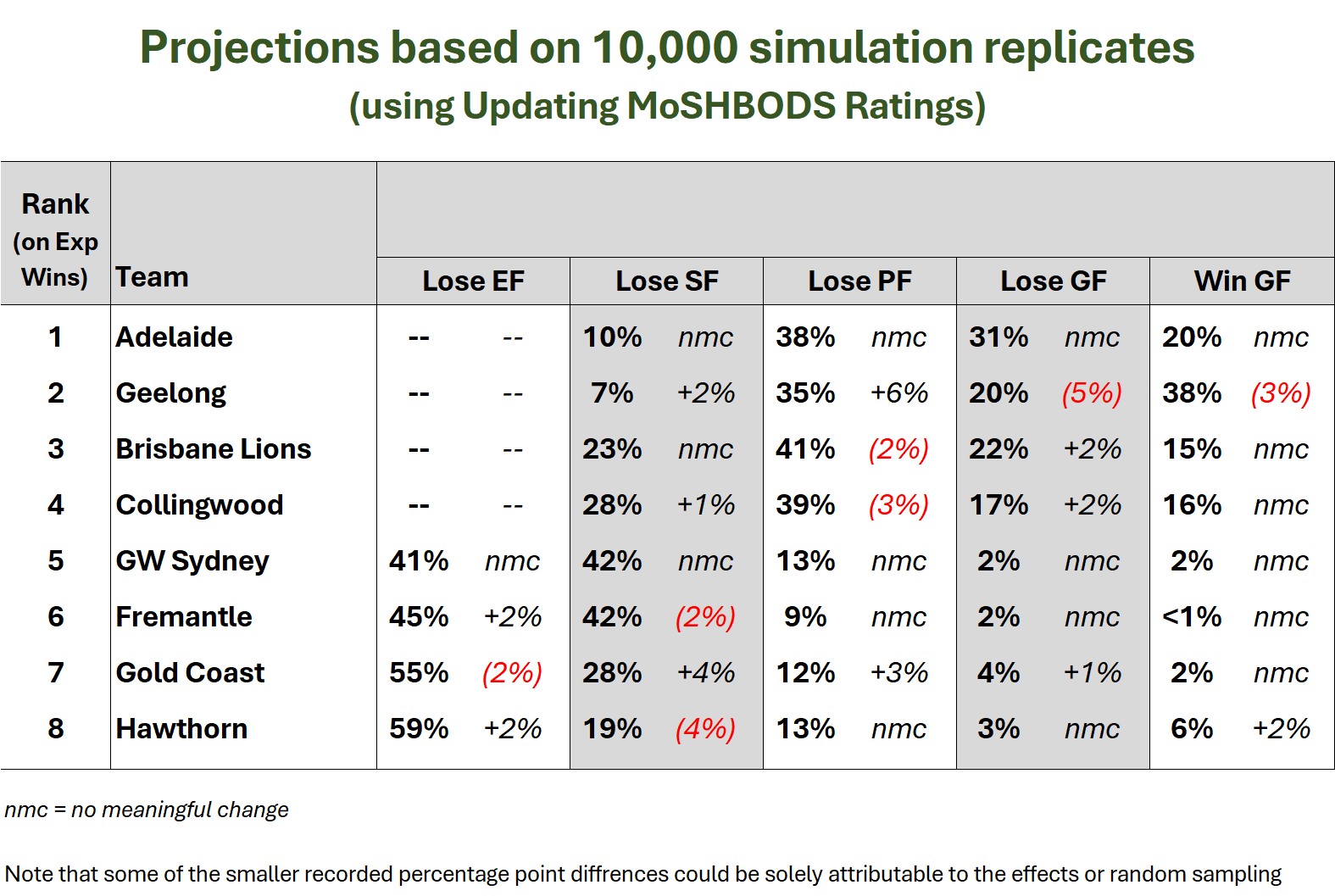 The new numbers suggest that there’s now only about a 1-in-8 chance that both of the Grand Finalists will be from Victoria, but about another near 3-in-4 chance that just one of the Grand Finalists will be a Victorian team.