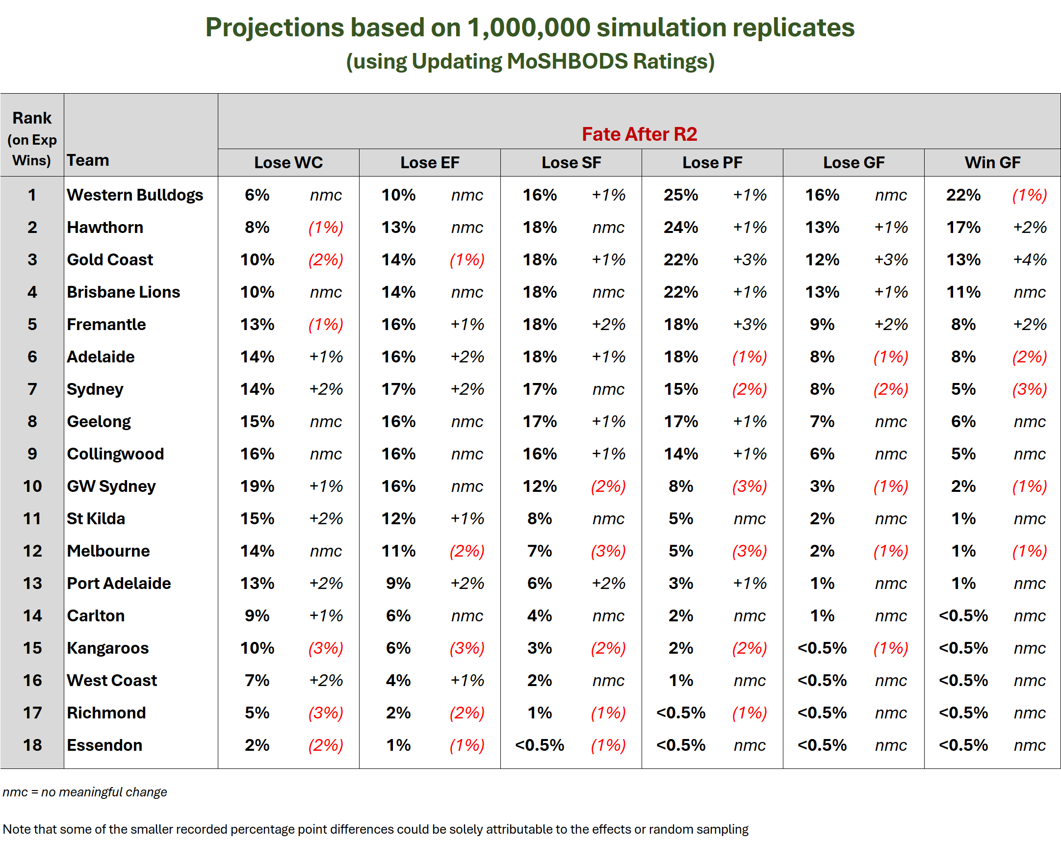 Western Bulldogs, Hawthorn, Gold Coast, and Brisbane Lions: about 90-95% chance of being finalists (including the wildcard finals); 50-60% chances of Top 4; roughly 10-20% chances of being Minor Premier