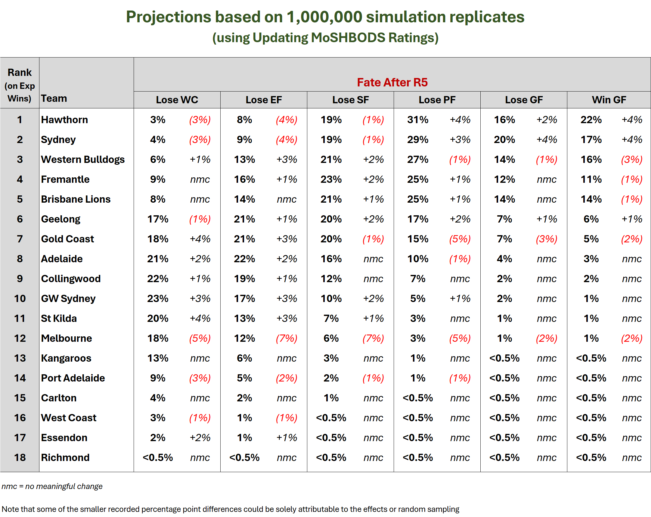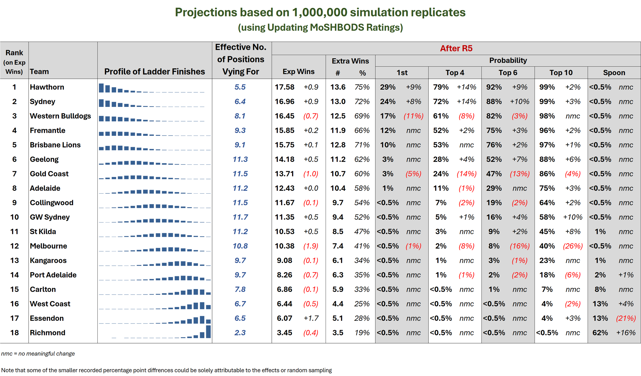 This year’s post Round 5 simulations suggest that the teams can be roughly grouped as below:
