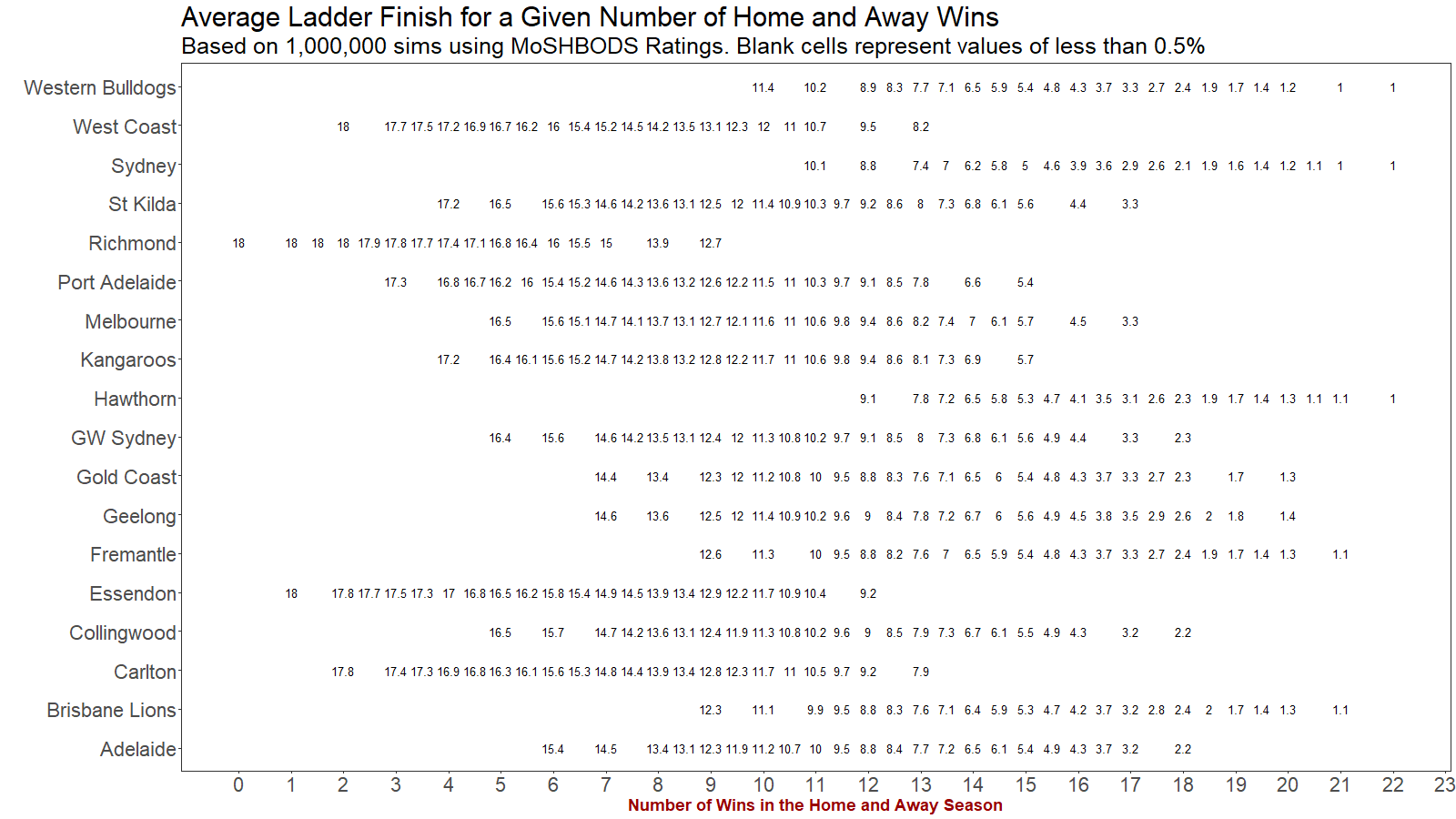 In the table below we look at the average ladder finish for each team for a given number of home and away wins.