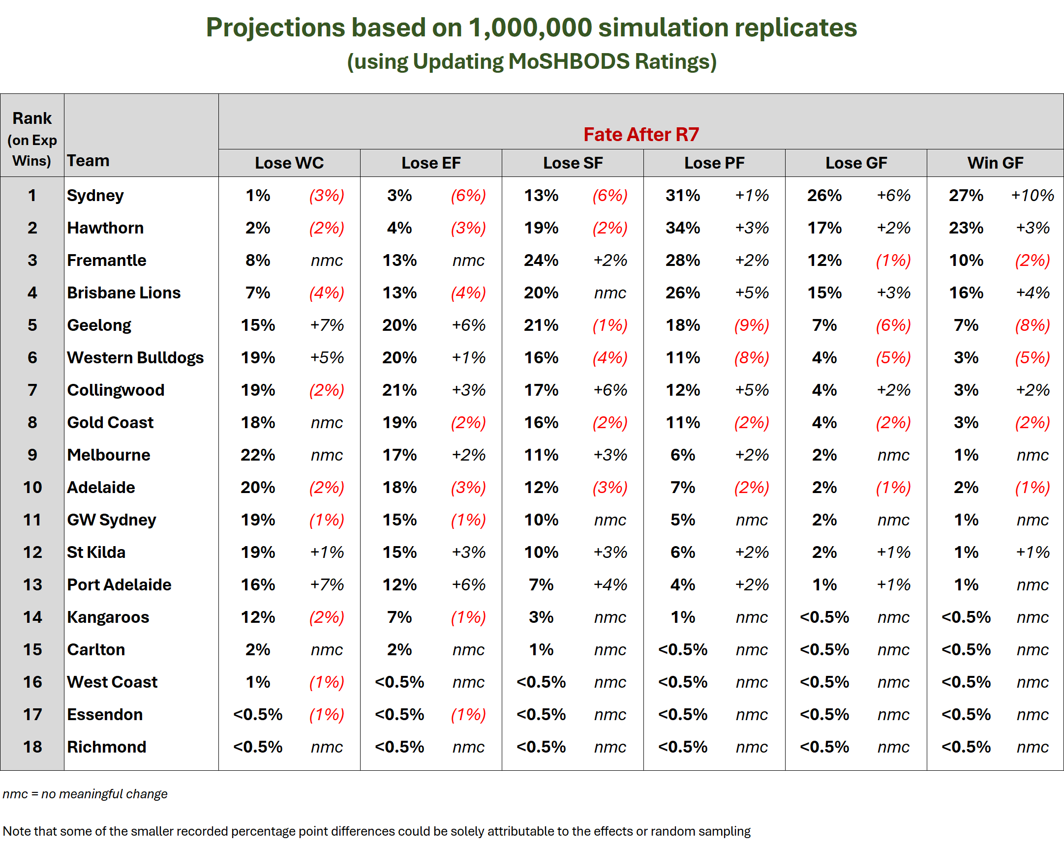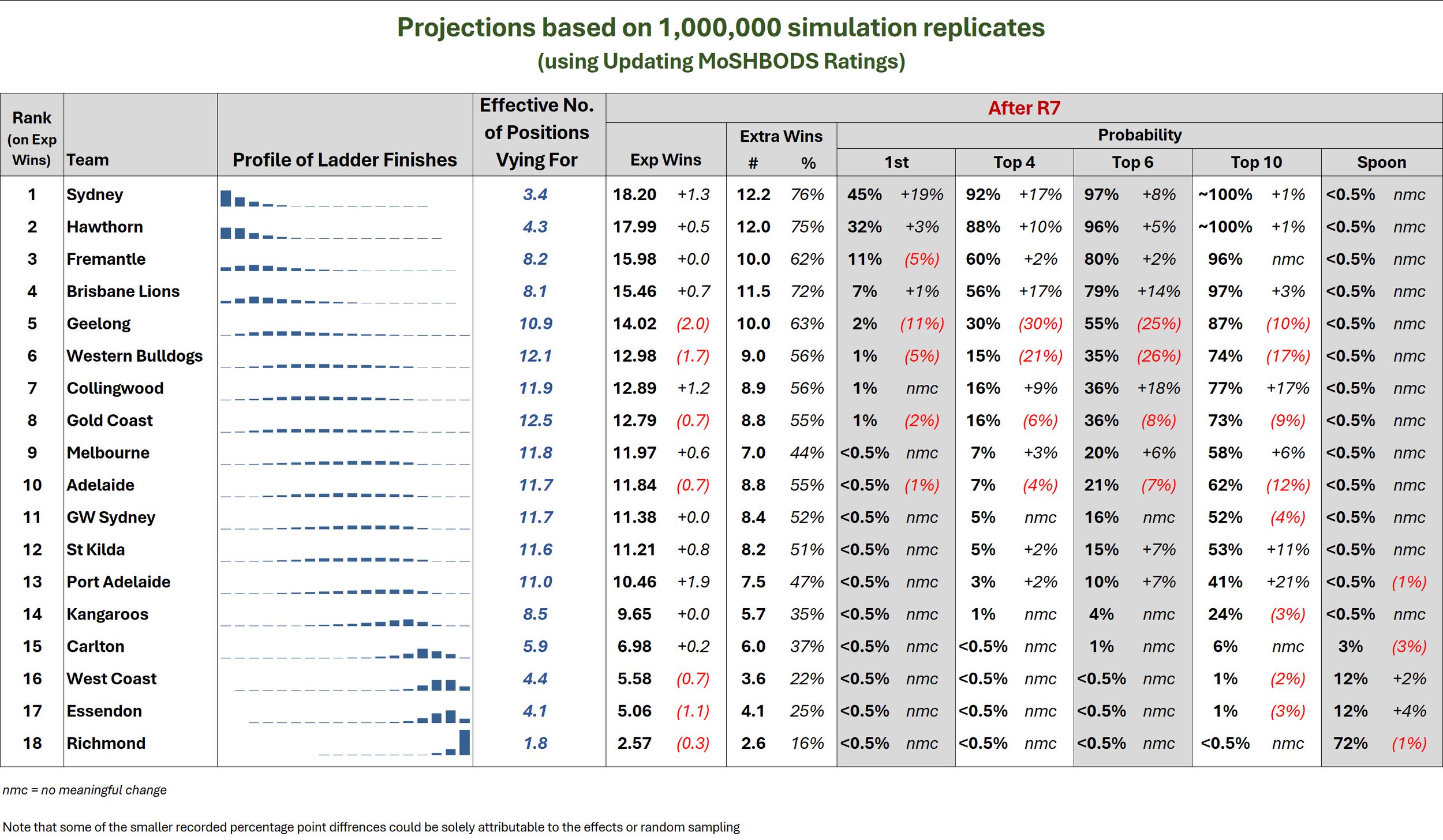This year’s post Round 7 simulations suggest that the teams can be roughly grouped as below: