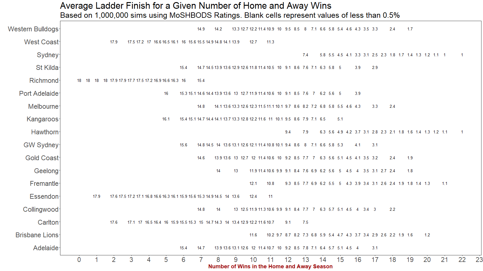 In the table below we look at the average ladder finish for each team for a given number of home and away wins.
