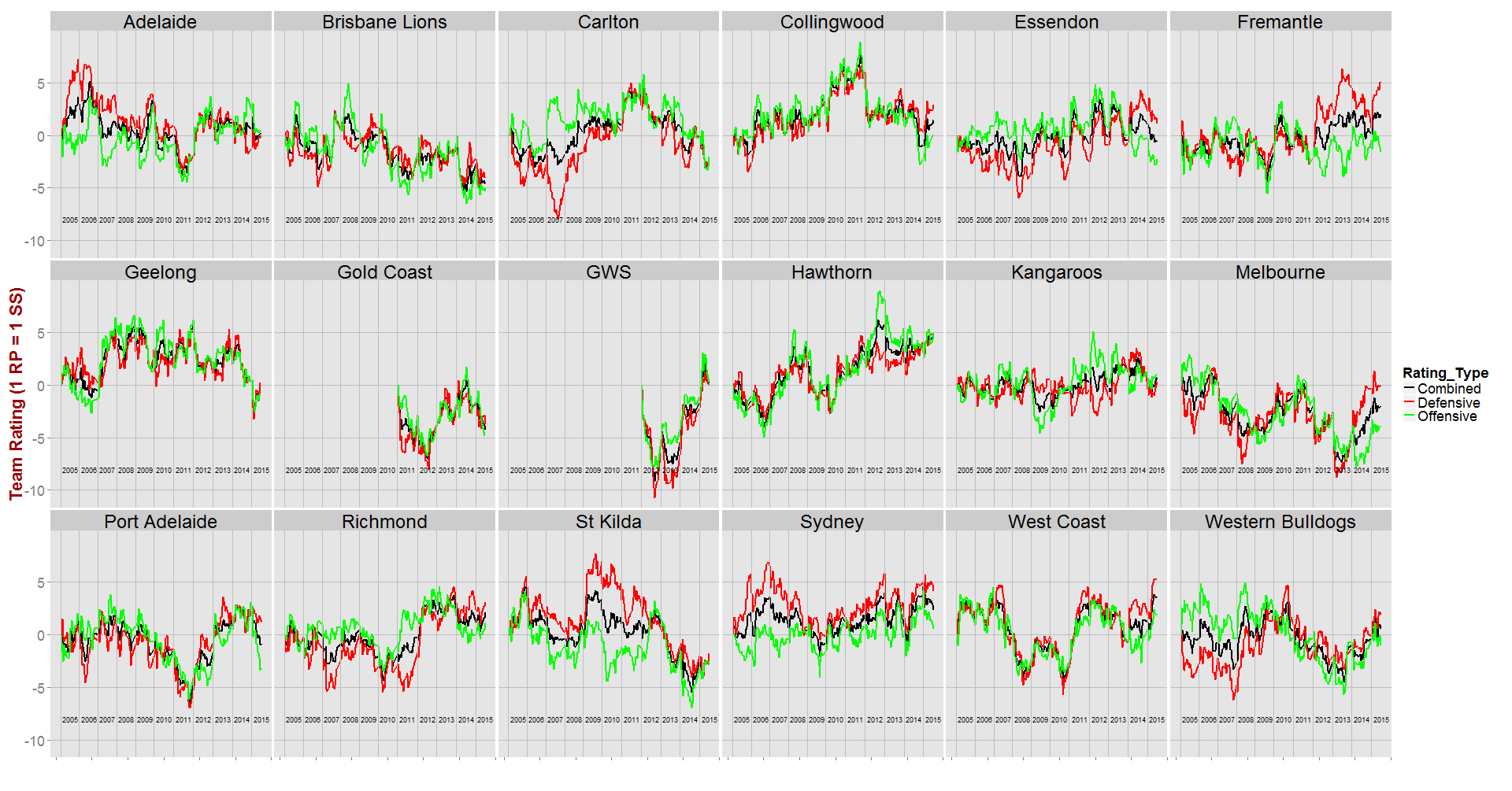 They have, however, appeared as one of the Top 25 Defensive teams of the modern era, their current average Combined Rating of +4.06 ranking them 12th. Top of that list are the 2009 Minor Premiers and Runners-Up, St Kilda, whose +5.73 average Combined Rating is almost half a Scoring Shot higher than any other team in the era.