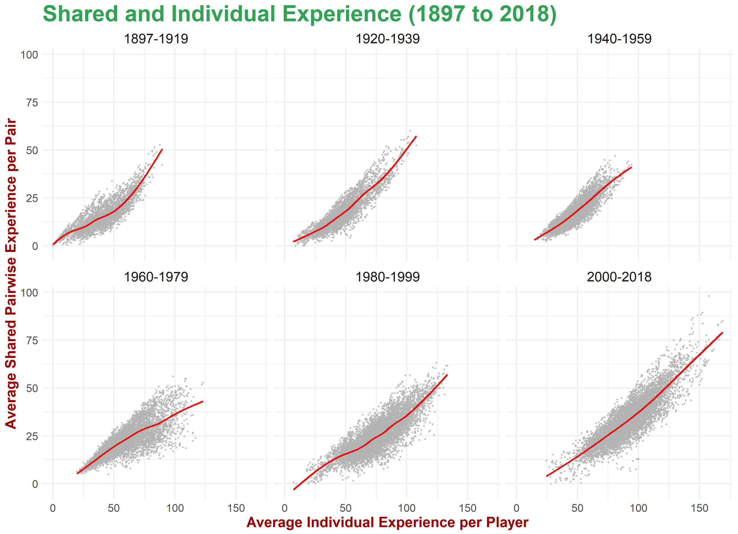 One of the striking features of this chart is the growth in the spread of average individual and shared experience over time. We can also see that, in most eras, the relationship between individual and shared experience is not strictly linear: at higher levels of average individual experience, shared pairwise experience grows more rapidly. In short, if a team has a lot of experienced players it will tend to have disproportionately high levels of shared pairwise experience.