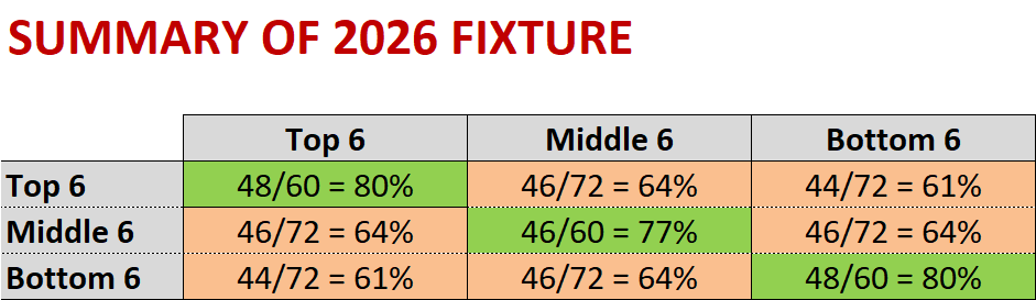 Previously, teams were fixtured to twice play against no more than three of the five other teams in their third, but this year this was increased to four, which has lifted the number of home and away games played between teams from the same third from last year’s 138 to 142 of a possible 180 (about 79%).