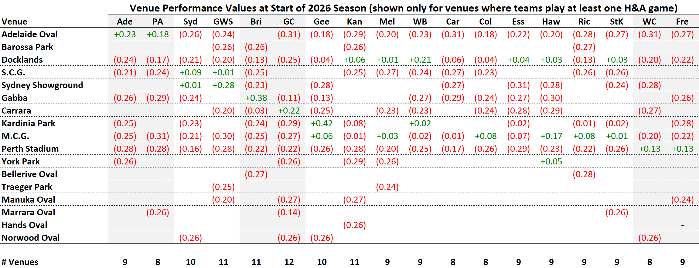 The Venue Performance Values, calculated as they would be on day 1 of the 2026 season, are summarised in the table below for all of the venues at which a team appears at least once sometime during the 2026 home-and-away season. For details on how these have been calculated, refer to this blog.