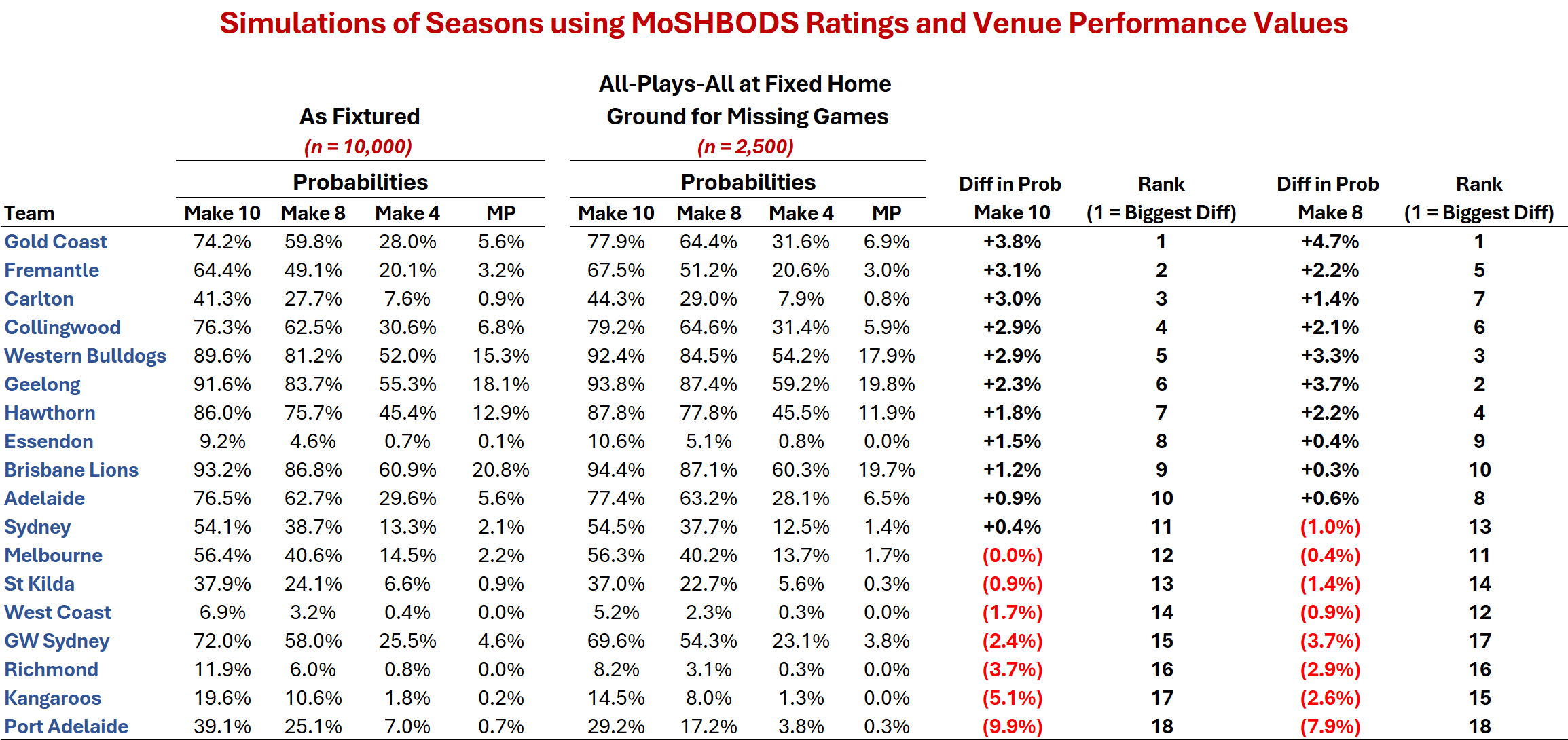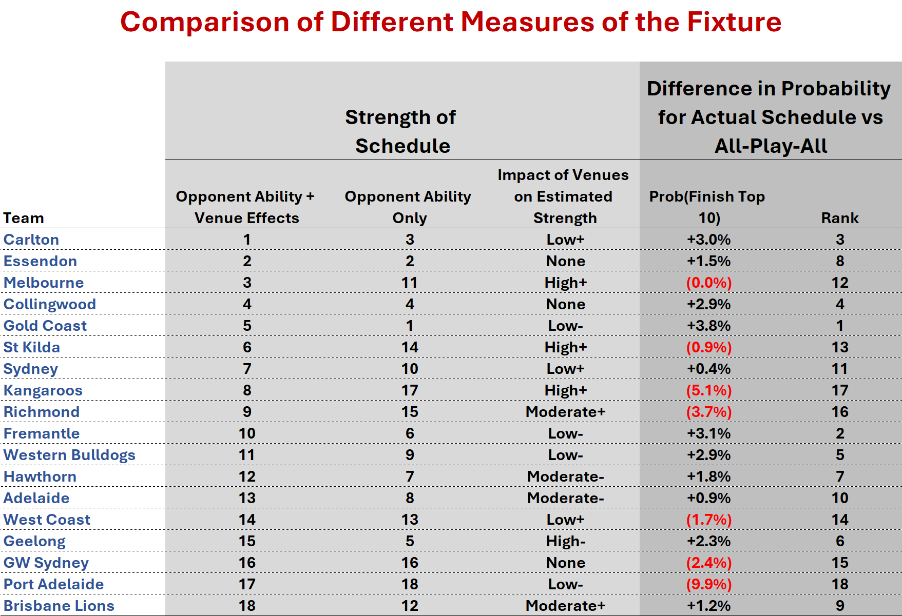 If we ignore venue effects, such is the underlying strength of the teams they face at home, Brisbane Lions rank 1st (from 13th!), Hawthorn 2nd, Carlton 3rd, Essendon 4th, and Gold Coast 5th. On this metric, Melbourne would slide into 9th, and St Kilda to 8th.