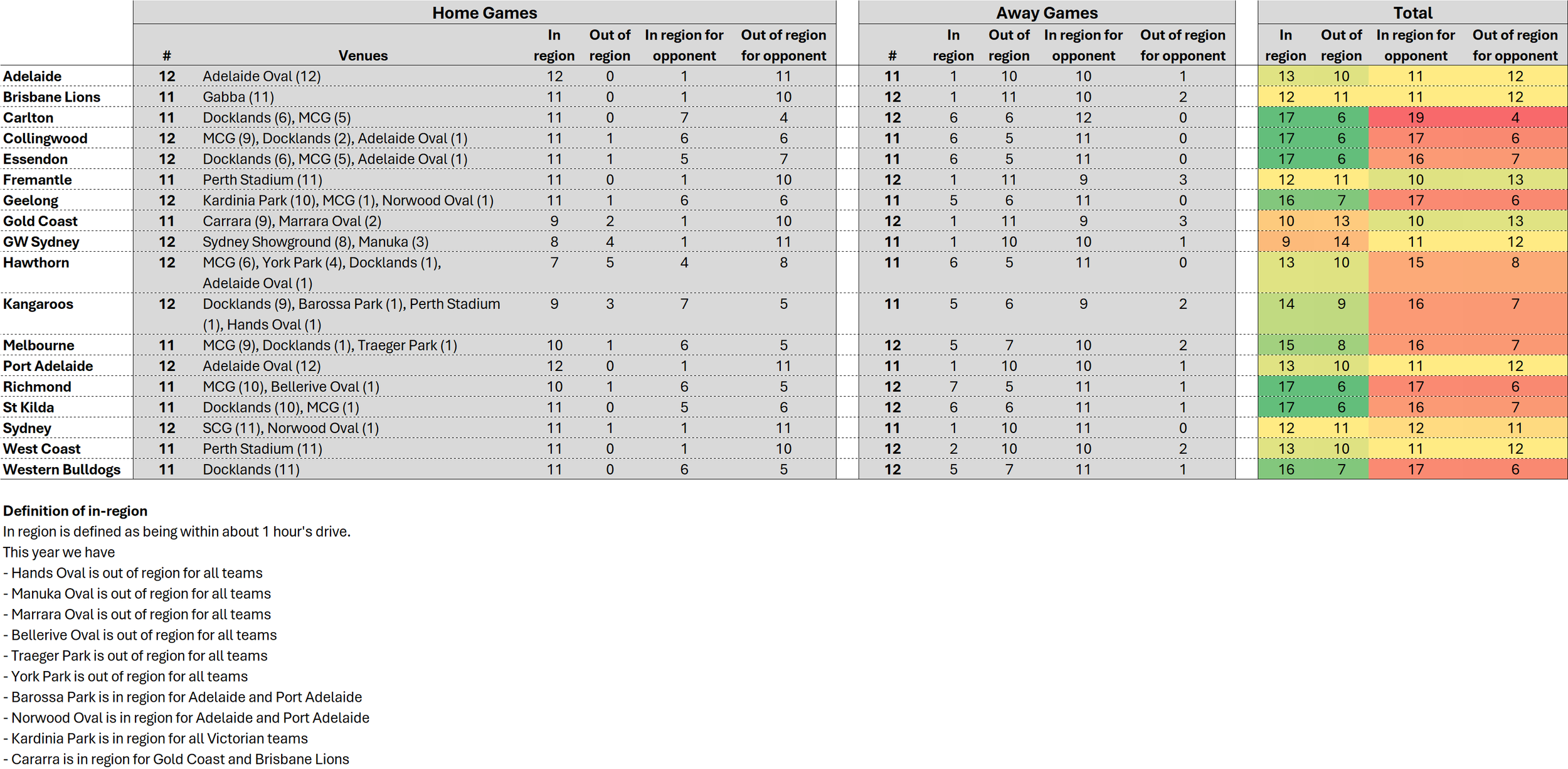 Only 4 of Carlton’s games are out of region for their opponents, and only 6 of Collingwood’s, Geelong’s, Richmond’s, and Western Bulldogs’