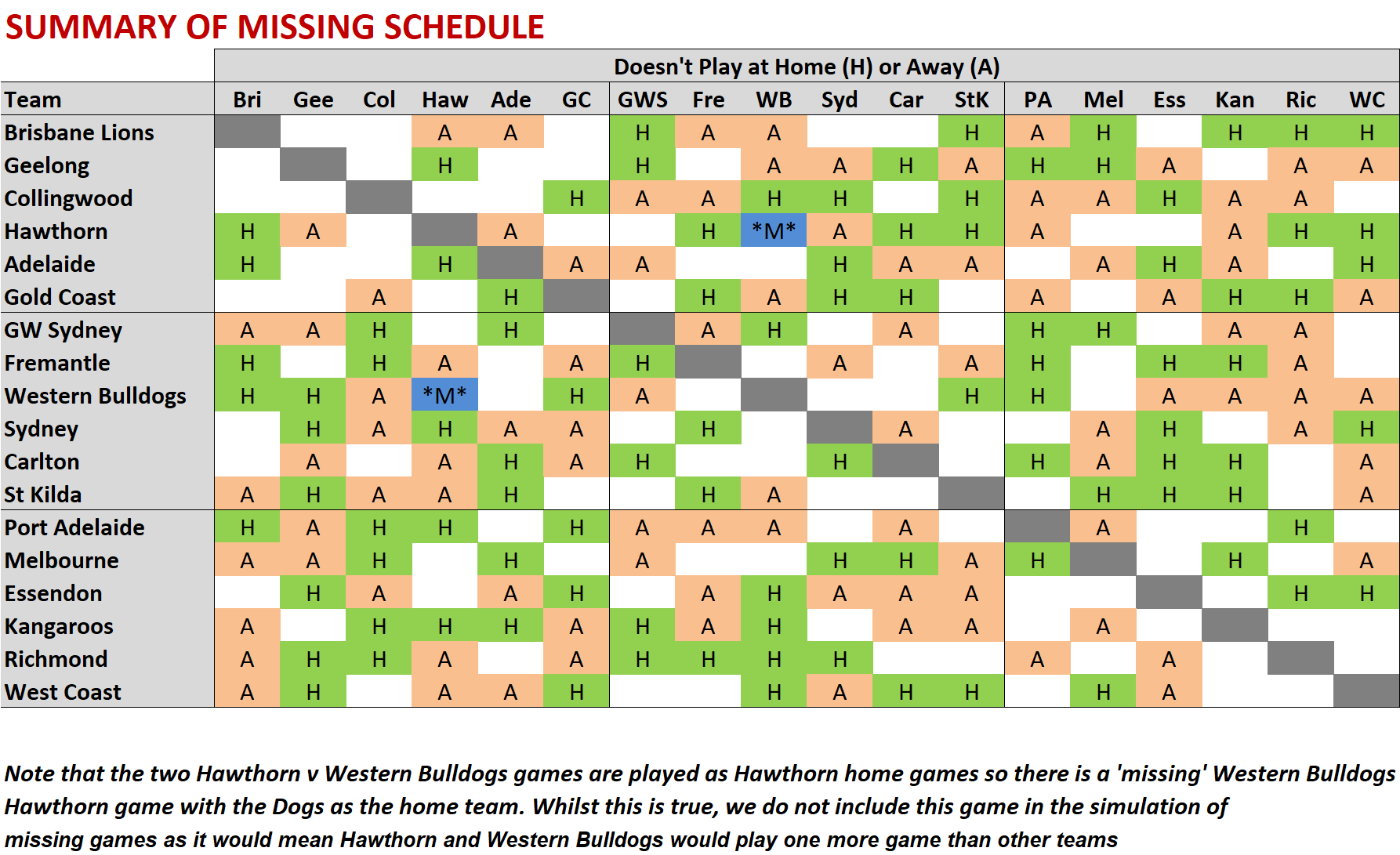 The table below summarises the missing games in the 2026 Fixture, denoting with H's those games missed that would have been home games for the team named at left of the row, and as A's those that would have been away games for the team named at left of the row.