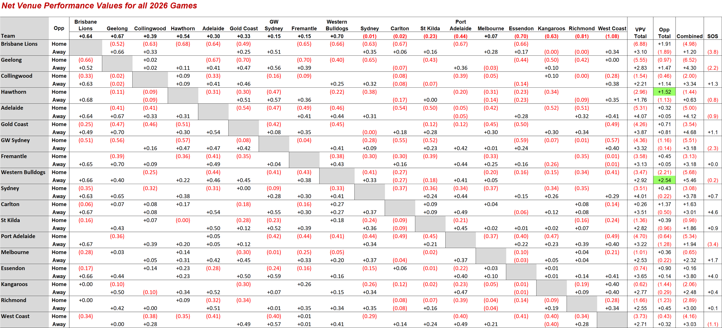 The table below (click on it to access a larger version) provides a full breakdown of the Strength of Schedule calculation for every fixtured game. The top row of figures records the Combined Rating of the relevant team, and the numbers in the body of the table the Net VPVs for each contest.
