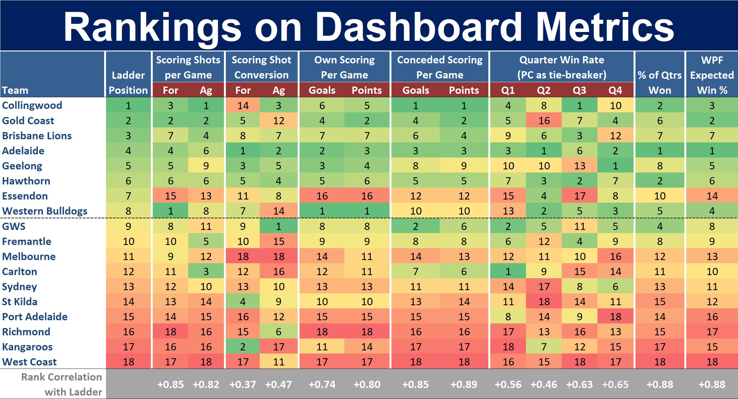 /Below is the latest Ranking on Dashboard Metrics table, which continues to show that the teams currently in the Top 8 deserve to be there based on the metrics shown here (note that I order teams based firstly on the percentage of available competition points they have accrued and then on percentage). The persistent exception remains Essendon, who now rank no better than 4th on any metric, and 12th or lower on 9 metrics, and who have a percentage of just 85. The Win Production Function now suggests that their scoring data justifies 14th position on the ladder.