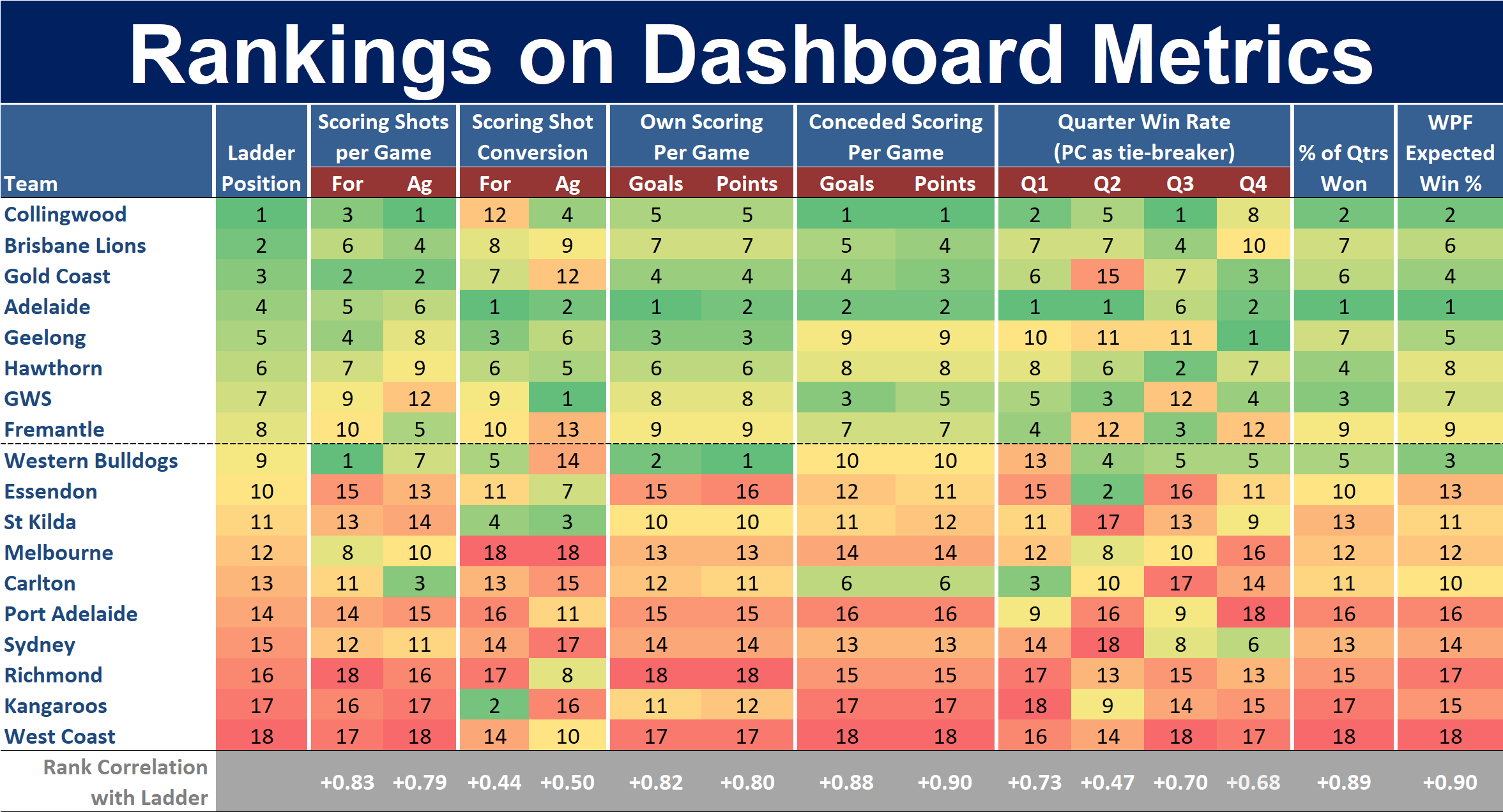 The metrics currently most rank correlated with ladder position are: