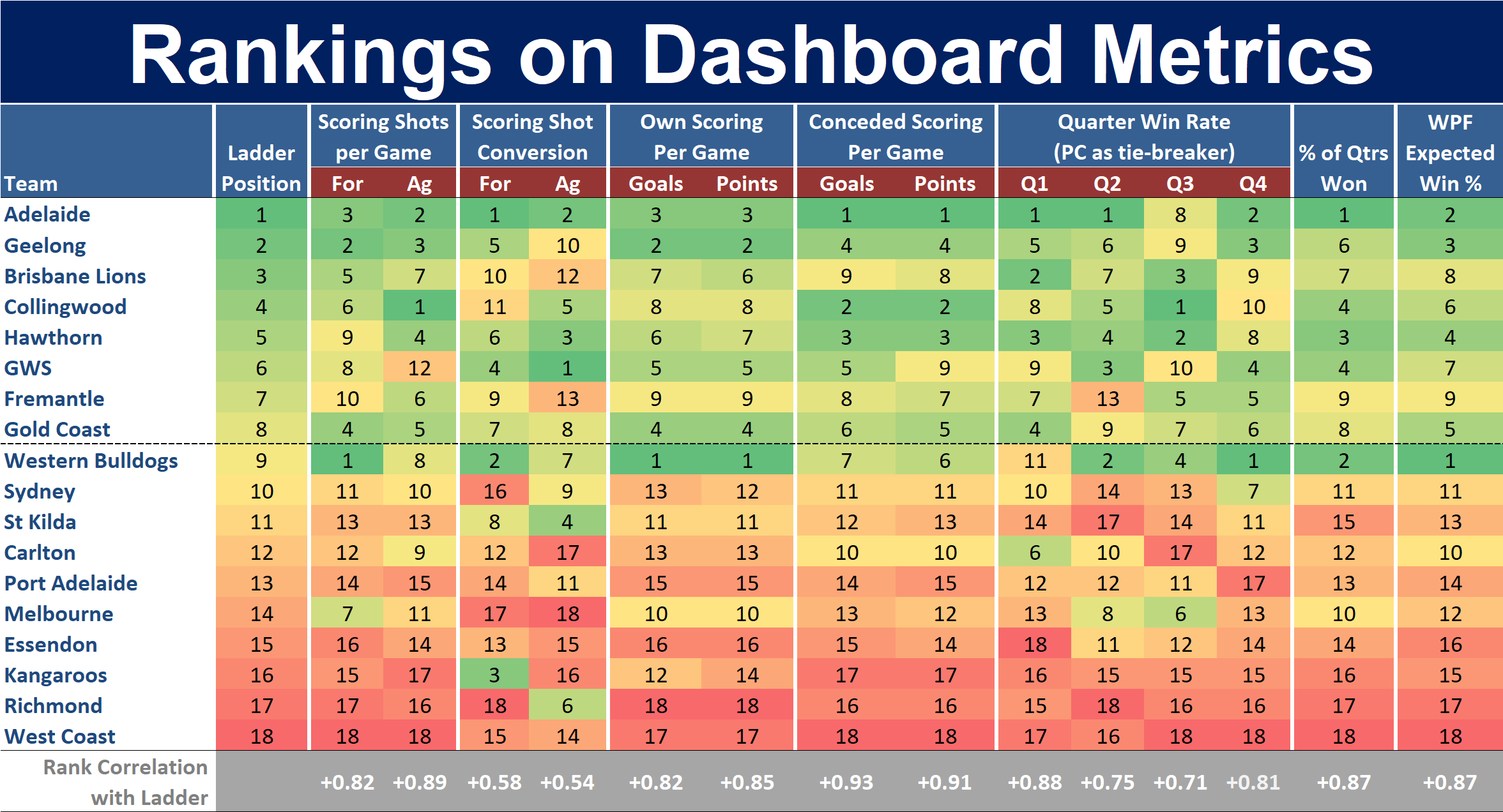 No metric is currently rank correlated less than +0.5 with ladder position.
