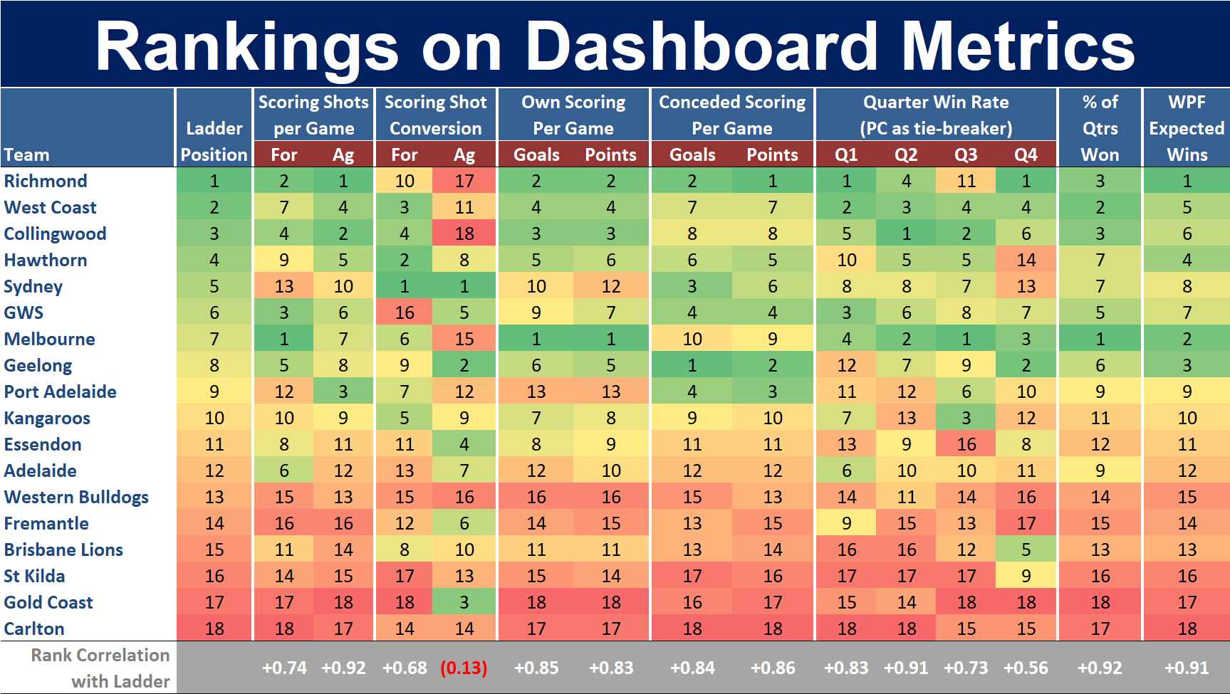 Every other team is ranked identically based on Expected Wins and the competition ladder.