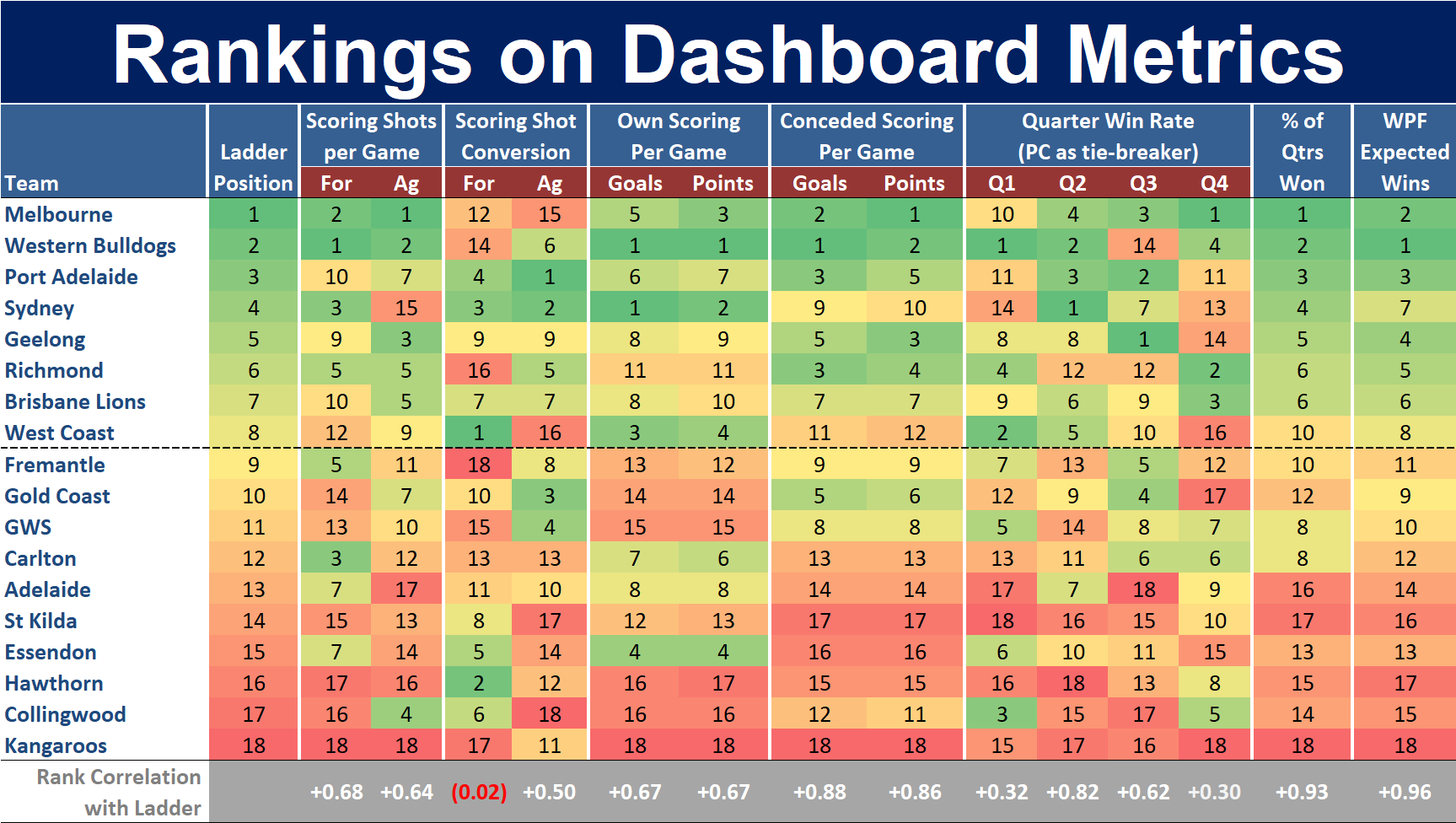 /Below is the latest Ranking on Dashboard Metrics data, which still shows some surprisingly low correlations between the teams’ ranking on key dashboard metrics and their placement on the competition ladder.
