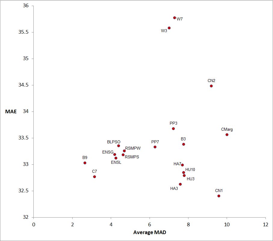 So, to this point in the season, conformity with the consensus has, on-balance, benefitted Tipsters and Predictors, most widely amongst the head-to-head forecasters where there are no significant exceptions, and amongst probability predictors where there's only one significant exception. Amongst margin predictors the returns to conformity have been more mixed, with seven predictors finding themselves well away from the general MAE / MAD trade-off line.