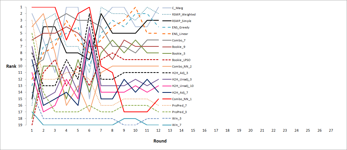 The H2H family and four of the Heuristic Tipsters fared worst this week, tipping only two winners, and the all-Tipster average finished at just 2.77 correct tips per Tipster for the round, the third-lowest accuracy rate for a round the season.