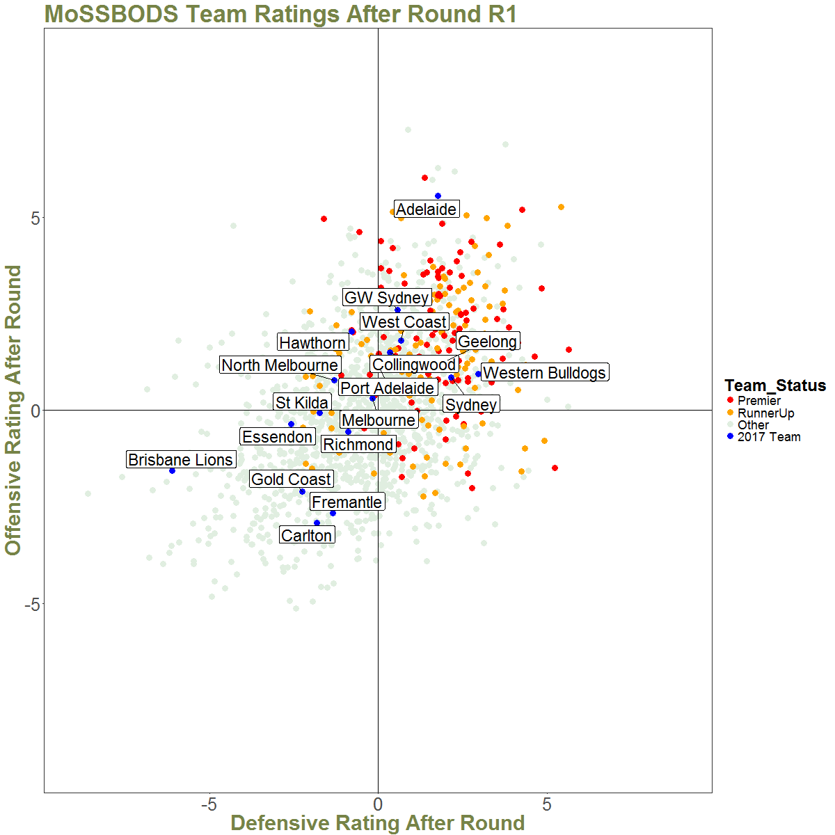 Further down there's only minor disagreement about team rankings, the only multi-spot differences those for Collingwood, ranked 6th on MoSSBODS and 8th on MoSHBODS, and for Geelong, ranked 8th on MoSSBODS and 6th on MoSHBODS.