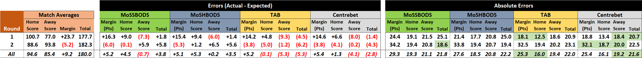 Taken across the two rounds, the TAB is still best for game margins and home team scores, and Centrebet best for away team scores and game totals, although MoSSBODS closed the gap to Centrebet considerably on the game totals metric during Round 2.