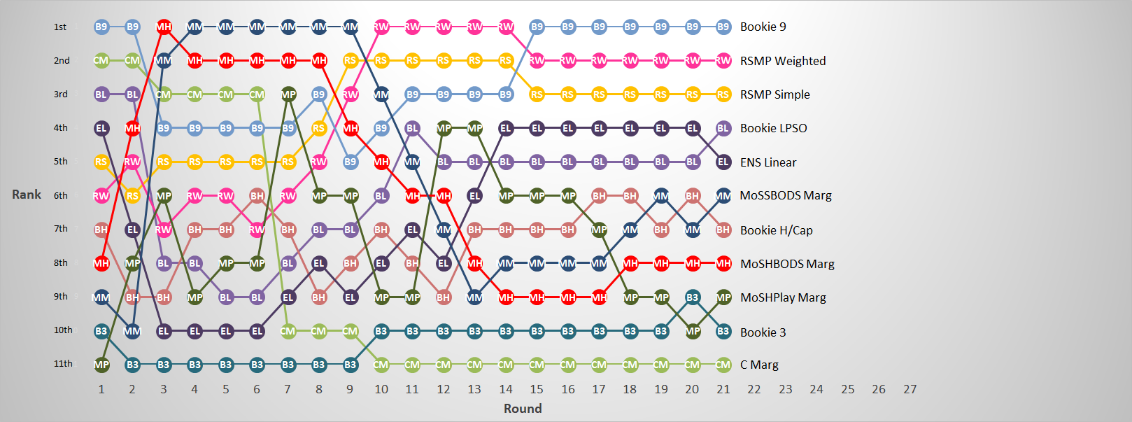 MoSHPlay_Marg’s result was good enough to see it elevated above Bookie_3 and into 9th, those two one of three pairs to trade places this week.