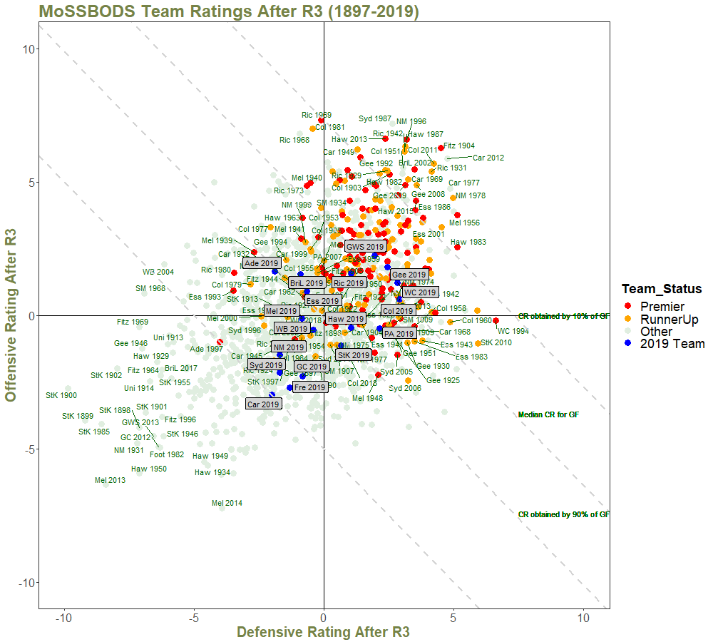 GWS, Geelong and West Coast all have Combined Ratings that are around or just above the median for all previous Grand Finalists at this point in the season.