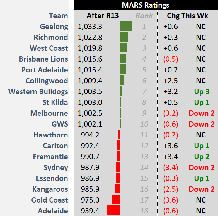 MARS continues to provide the most outlying rankings of the three Systems, it having the outright most-extreme ranking for 10 of the teams, with West Coast, and Carlton now the most notable examples.
